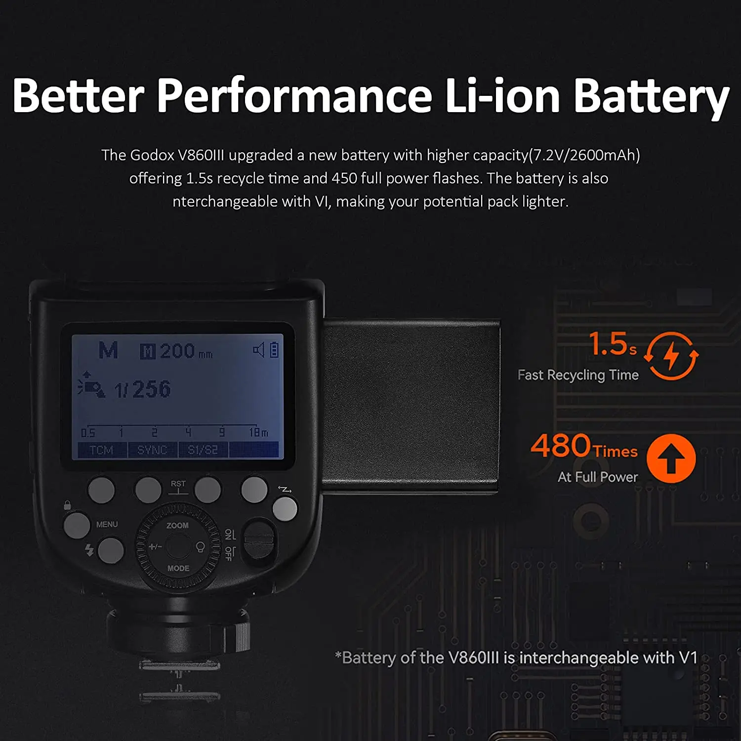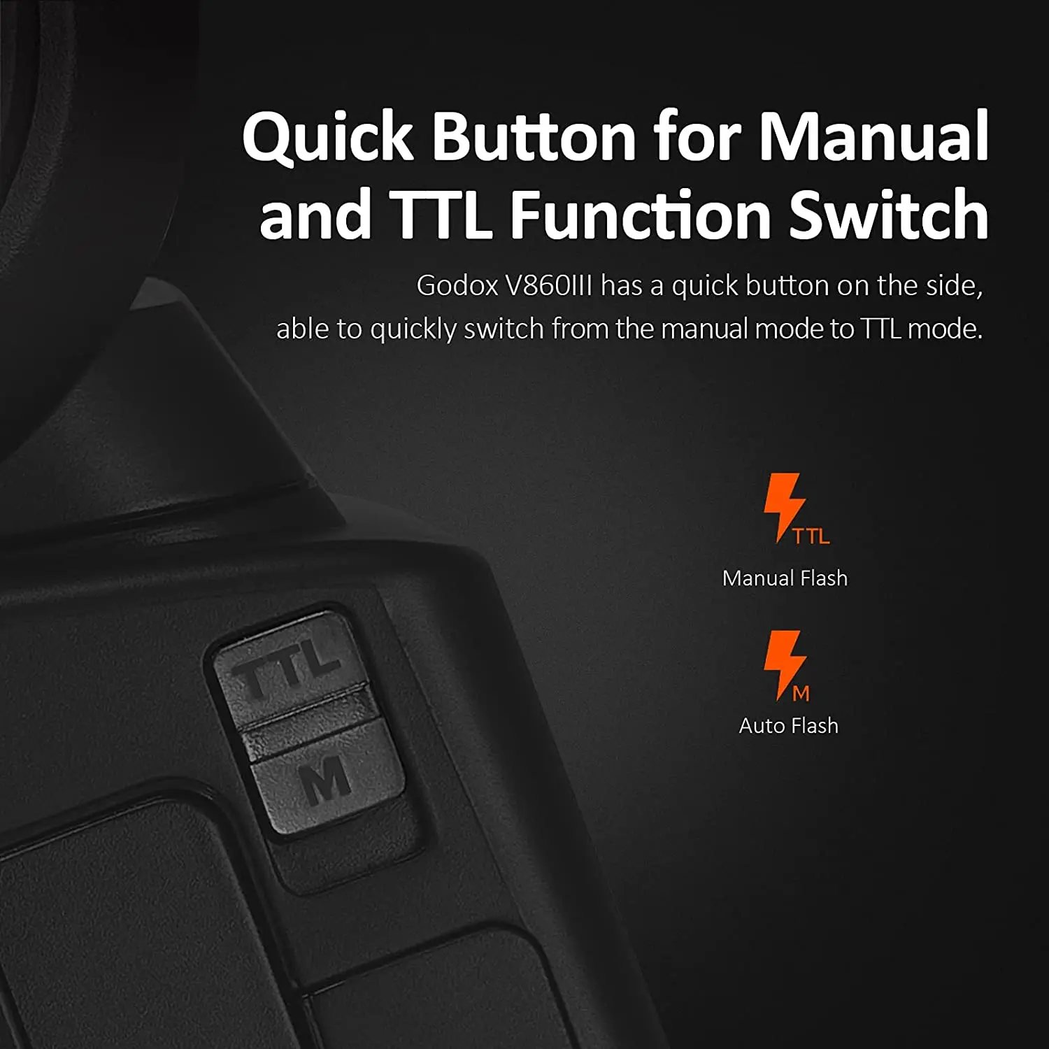 ● Моделирующий светильник:Добавлен моделирующий светильник спереди для предварительной визуализации и смешивается с окружающим светильник, с регулируемой яркостью в 10 уровней.● Быстрая кнопка для ручного и TTL функционального переключателя:Godox V860III имеет быструю кнопку сбоку, способную быстро переключаться с ручного режима на Режим TTL.● Лучшая производительность батареи:Модернизированный Новая батарея с большой емкостью (7,2 V/2600 мА · ч), предлагая 1.5s временем перезапуска и 480 вспышек полной мощности. Аккумулятор также взаимозаменяется с VI, что делает ваш потенциальный пакет легче.● Быстросъемный замок:Обновлено быстроразъемное крепление к быстрому рычагу для блокировки вспышки на горячий башмак камеры