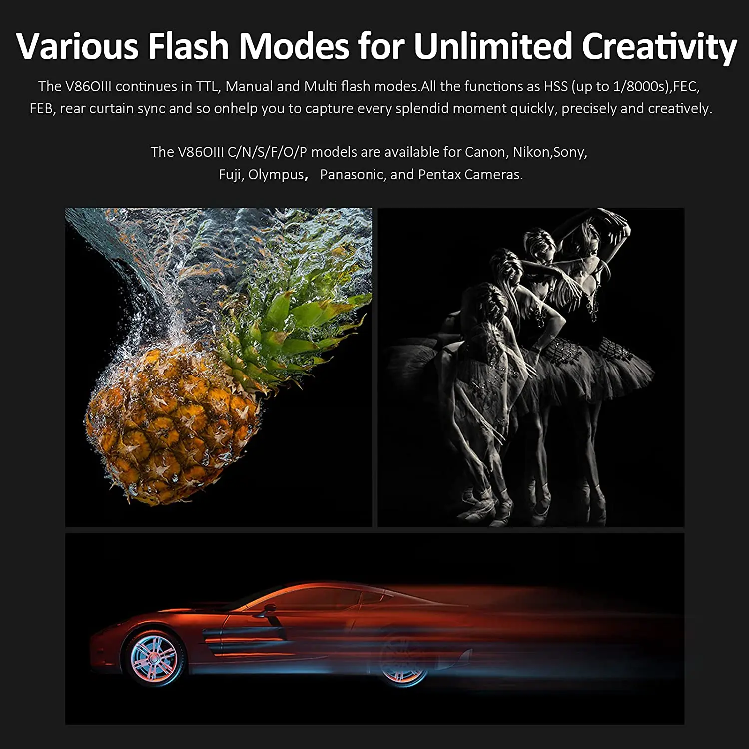 1. Встроенная беспроводная система Godox 2,4G X:Встроенная беспроводная система Godox 2,4G V860III предлагает все-в-одном функции, высокий направляющий номер GN60 и от 20 до 200 увеличительное покрытие вспышки, расстояние передачи до 100 метров. Оптическая передача с равномерным освещением и стабильным выходом.2. Улучшенная производительность батареи:Godox V860III-это обновленная версия Godox V860IIs, в котором есть новый аккумулятор с большей емкости (7,2 V/2600 мА · ч), предлагая 1.5s временем перезапуска и 480 полная мощность вспышек. Аккумулятор также взаимозаменяется с V1, что делает ваш потенциальный пакет легче.3. Полная поддержка TTL функций:Godox V860III совместим с камерами Sony Nikon Fuji Olympus Pentax, поддерживает автоматическую вспышку TTL, ручную вспышку, высокоскоростную синхронизацию 1/8000, компенсацию экспозиции вспышки, блокировку экспозиции вспышки, синхронизацию первого занавеса, синхронизация второго занавеса, моделирование вспышки и т. Д.4. Усовершенствованные функции:Godox V860III добавил моделирующий светильник спереди, чтобы помочь предварительной визуализации, и смешивается с окружающим светильник, с яркостью затемнения в 10 уровней; недавно добавили быструю кнопку сбоку, чтобы быстро переключиться из ручного режима в режим TTL; Обновлено быстроразъемное крепление к быстрому рычагу для блокировки вспышки на горячий башмак камеры.5,Master & Slave Flash:V860IIIS в качестве главного блока управления вспышками камеры Sony, например, HVL-F60M, HVL-F43M и HVL-F32M через беспроводную сеть; В качестве подчиненного блока под контролем камер Sony мигает, например, HVL-F60M, HVL-F43M и HVL-F32M.
