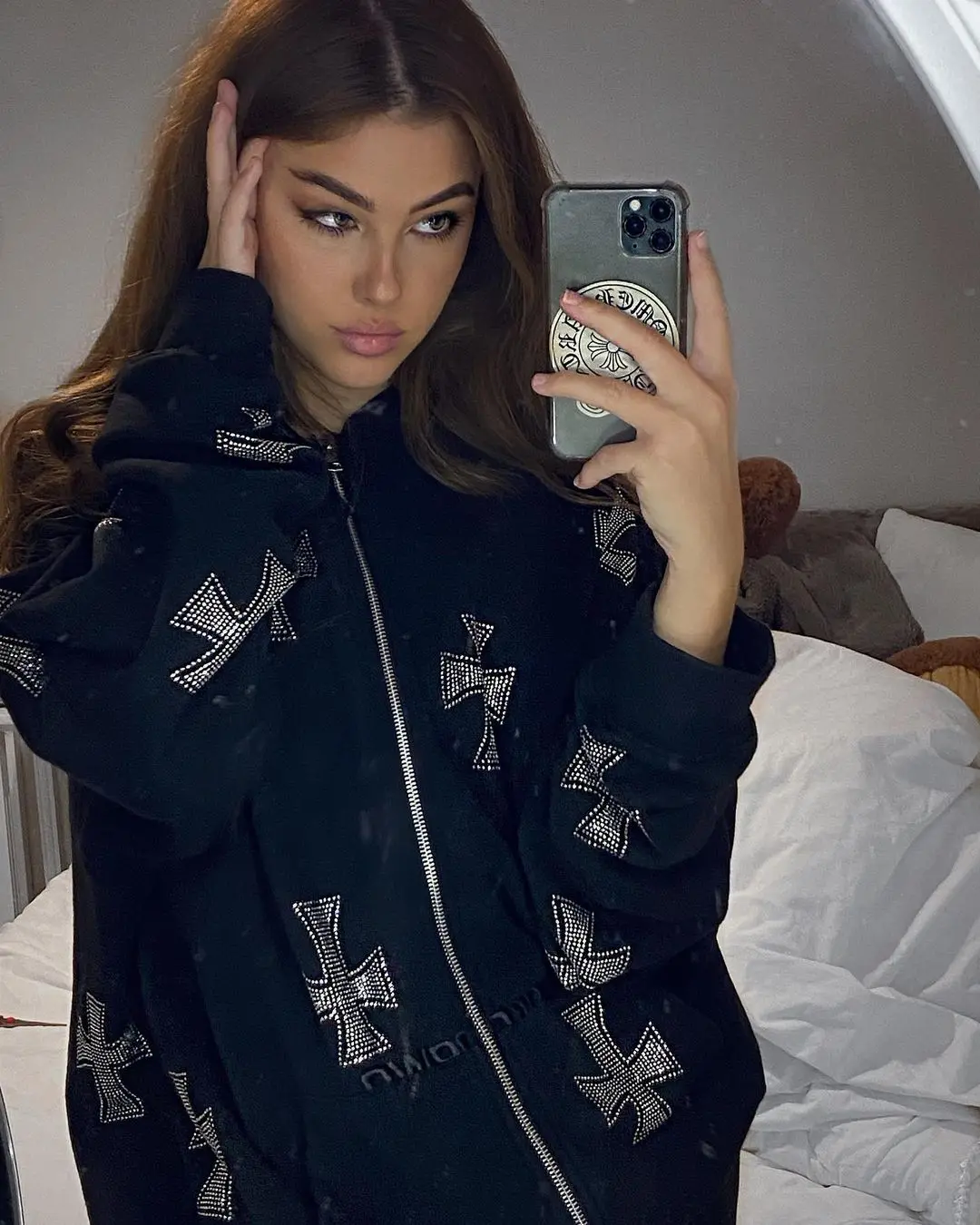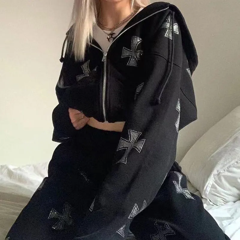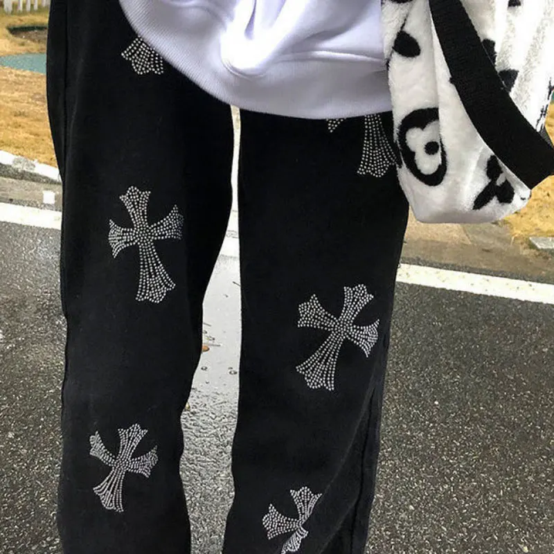 Y2k Harajuku Cross Стразы прямые широкие брюки костюм женские амери...