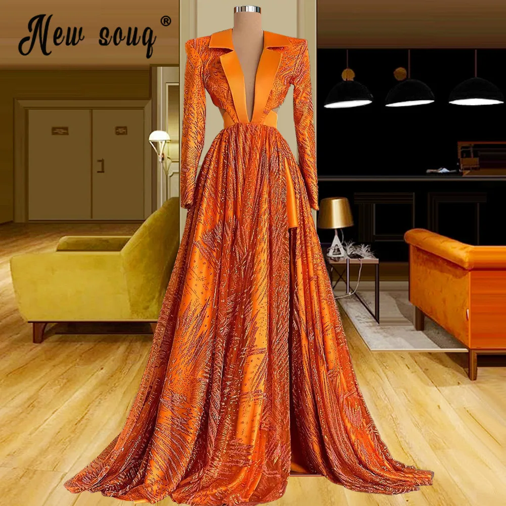 Мусульманское Африканское вечернее платье с длинным рукавом женское ТРАПЕЦИЕВИДНОЕ оранжевое длинное платье Глубокий v-образный вырез Бисероплетение от выпускного бала размера плюс