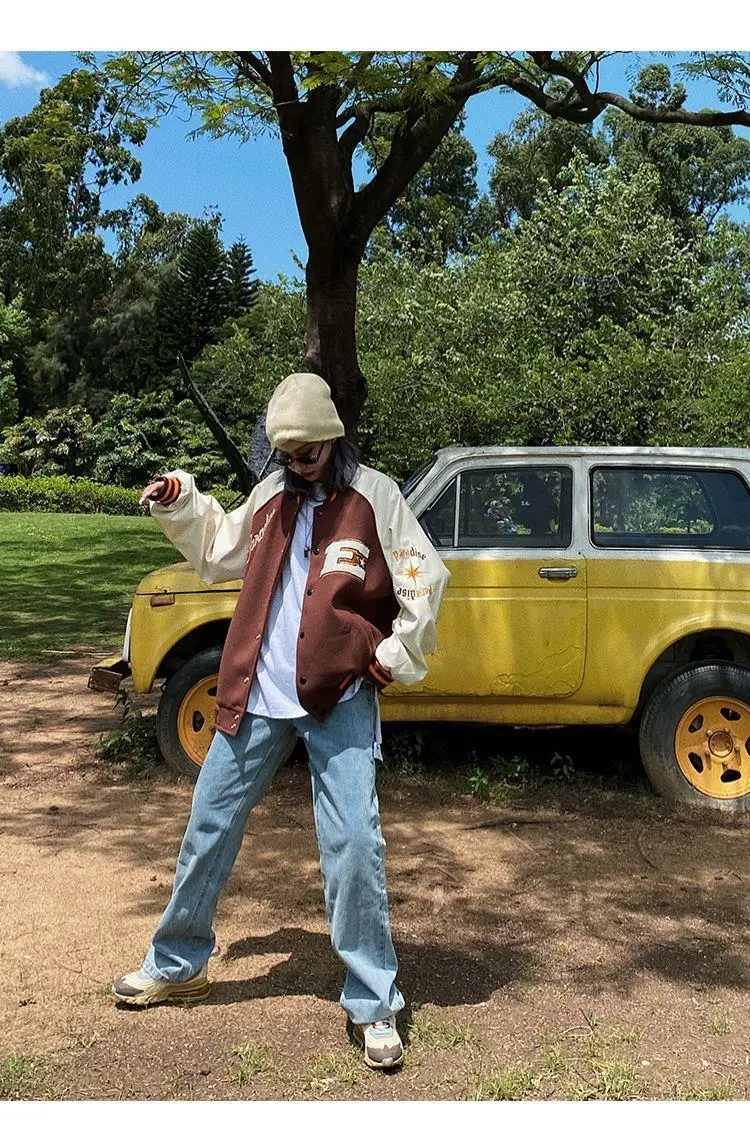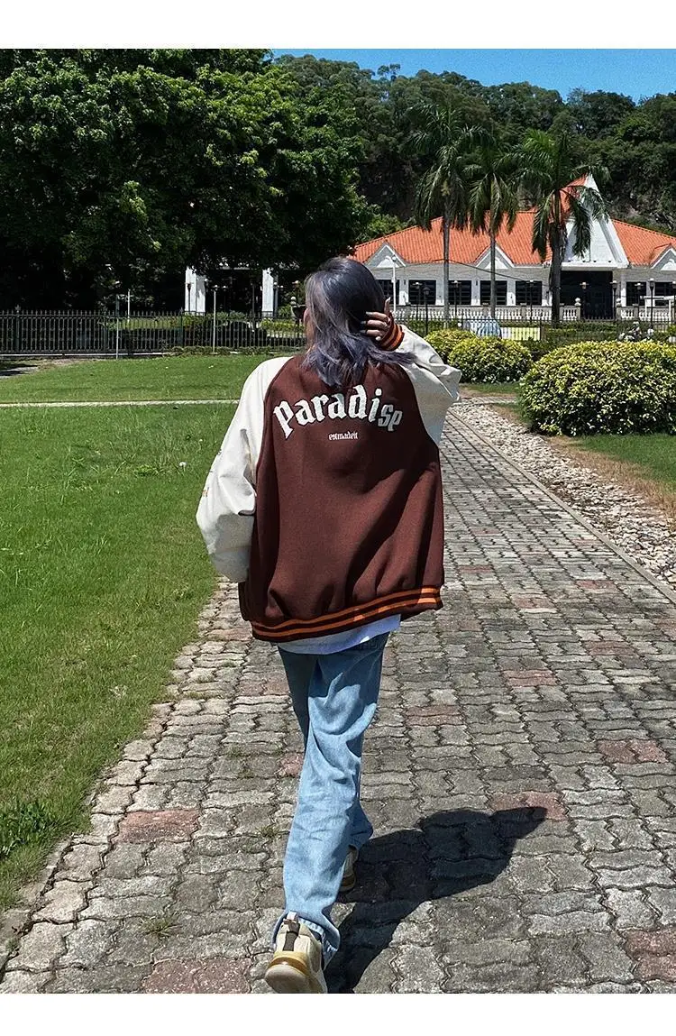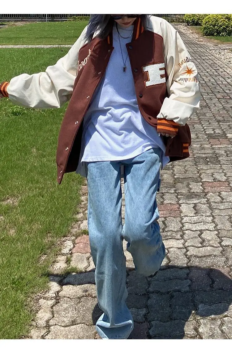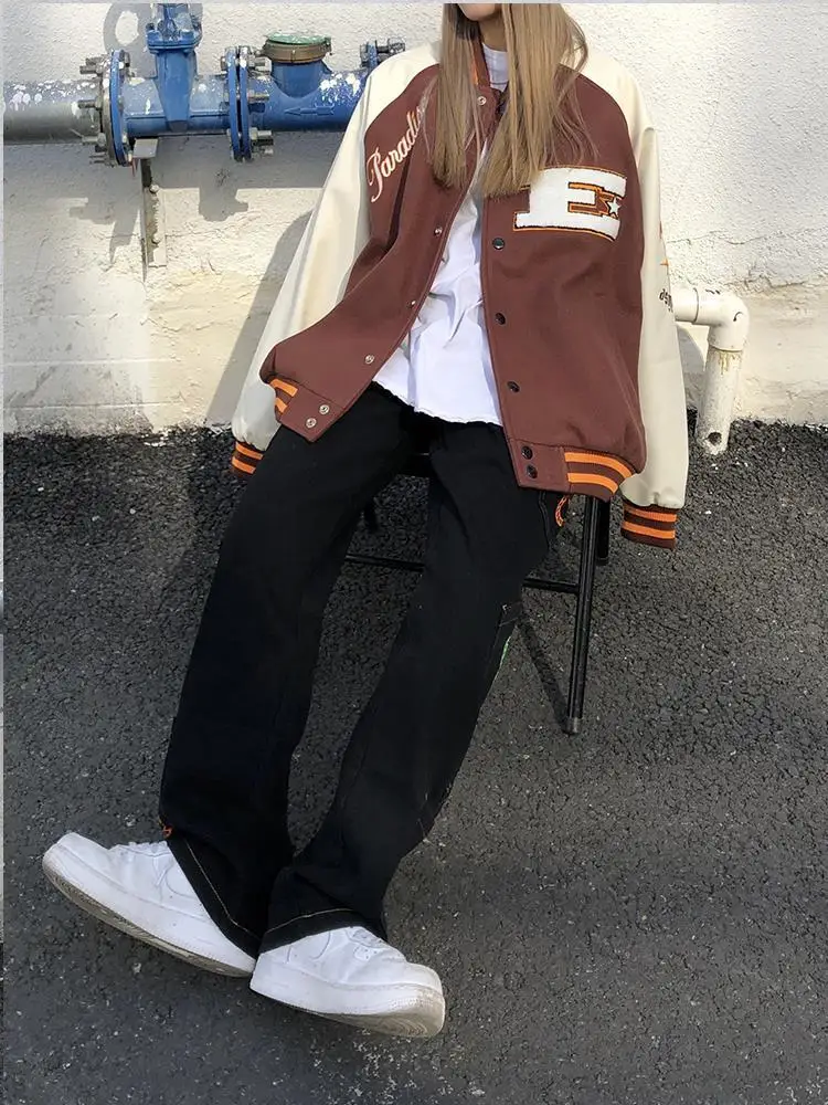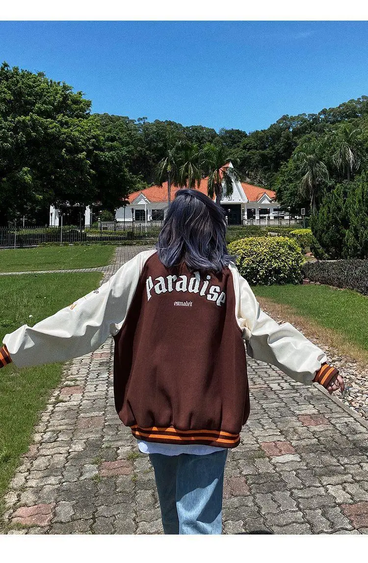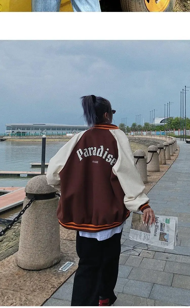 Куртка в стиле Харадзюку, коричневая бейсбольная куртка-бомбер, Жен...