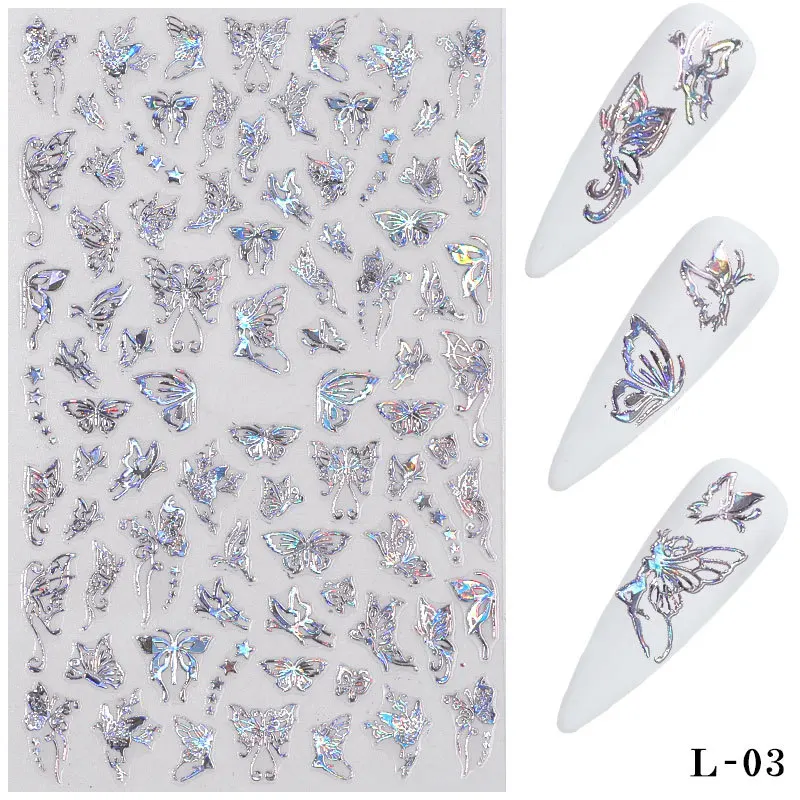 Объемные голографические наклейки для ногтей с бабочками, серебрист...