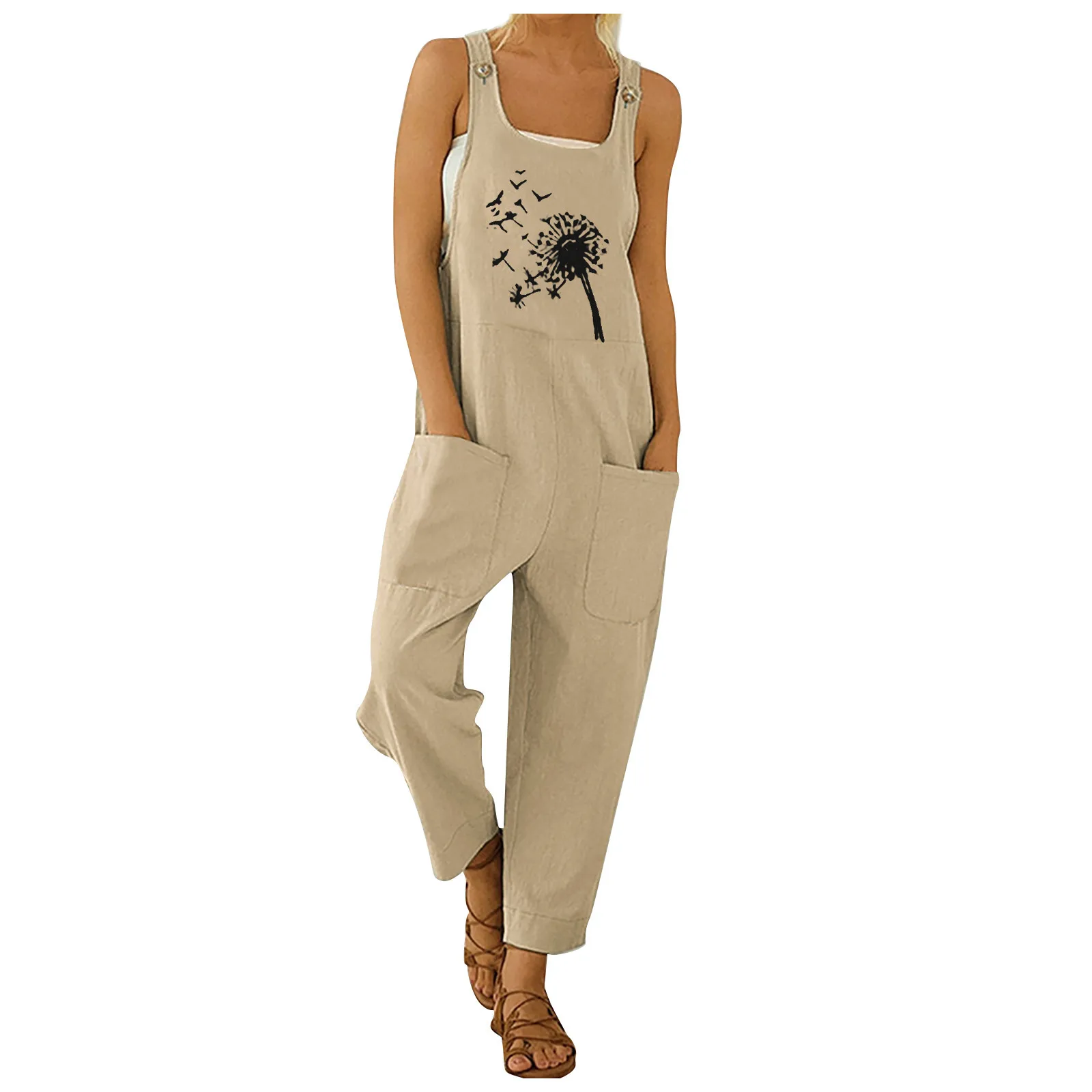 Женский Повседневный комбинезон в стиле бохо, комбинезон с принтом одуванчика и карманами, длинный комбинезон на бретелях, женская модель на бретелях, уличная одежда