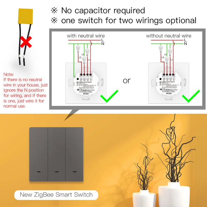 1. Новый дизайн с нейтральным проводом и одиночным живым проводом, входящим в одну панель переключателя; Не требуется нейтральная проводка для одной версии провода; Проводите нейтральный провод на переключателе при необходимости; конденсатор не нужен для Новая версия обновления для лучшего пользовательского опыта без шума от электрического тока; Tuya Zigbee hub необходим для нормального использования этого переключателя, отличающегося такой же совместимостью с смарт-устройствами tuya, как и любыми другими концентраторами.