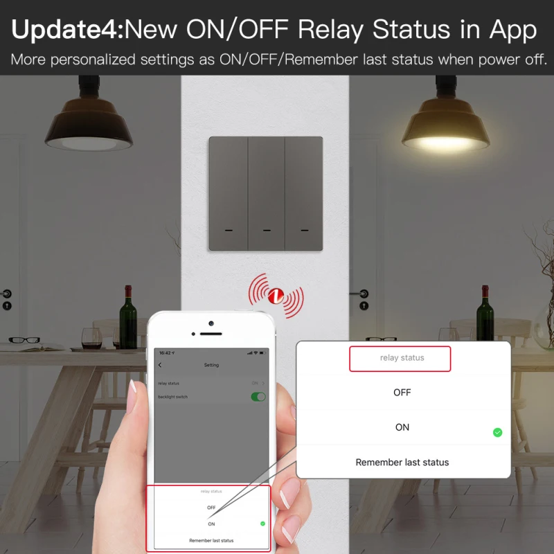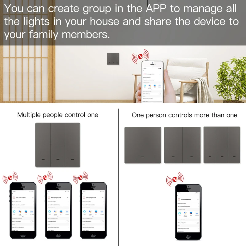 2. Новая идея для цепи 2/3 (два переключателя управляют один светильник), которая объяснена как многоуправляемая связь этого переключателя с другими смарт-переключателями в приложении; включение/выключение статуса реле, как помните последний Статус, когда выключение питания и задний светильник, Настройка в приложении Smart Life для лучшего сна ночью; Емкостное сенсорное управление, Включите/выключите светильник одним касанием и устойчивостью к царапинам стеклянная панель дает лучший вид, чтобы сочетаться с любым дизайном стены. (Примечание: Вы можете управлять несколькими связями этого переключателя с несколькими различными переключателями, но несколько банд на одном коммутаторе недоступны, для мульти-контроля можно использовать только один переключатель.)