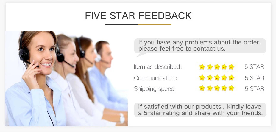 1. Ваше подтверждение будет высоко оценено после получения товаров. Как только вы получили товар, надеемся, что вы оставите нам положительный отзывы (4 или 5 звезд).2. Прежде чем оставлять негативные отзывы. Сначала свяжитесь с нами, и мы поможем вам решить проблему.3. Мы стремимся сделать все лучше, чтобы вы были довольны!