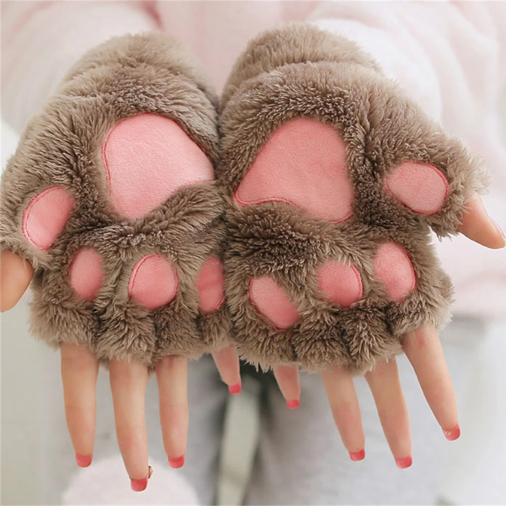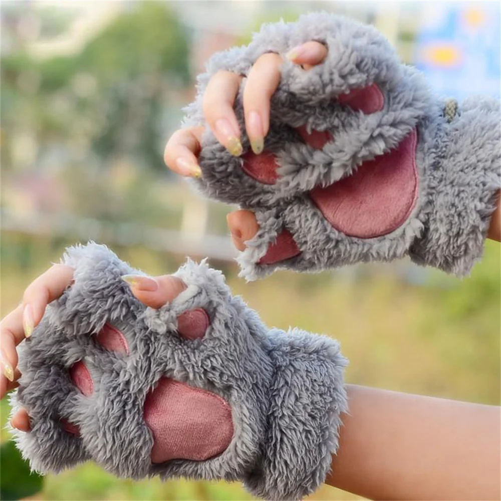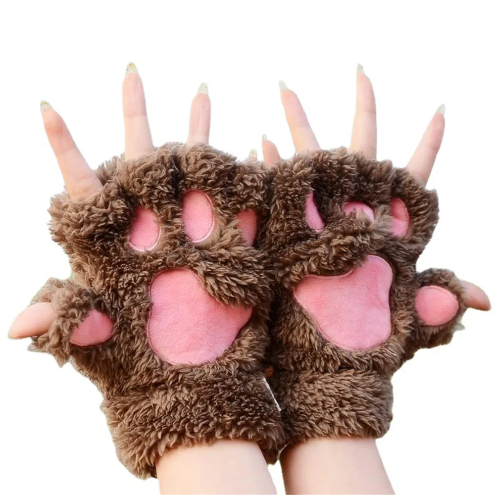 Симпатичные плюшевые перчатки для женщин, теплые мягкие пушистые утепленные митенки с полупальцами в виде медвежьей лапки для косплея вечерние, кошачья лапа с когтями