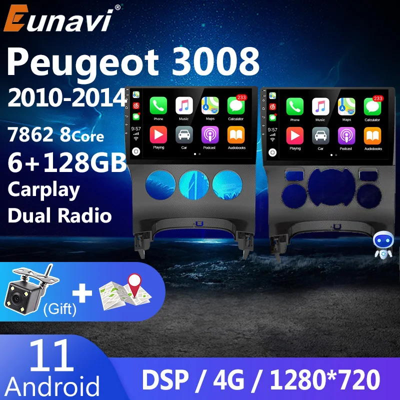 Автомагнитола Eunavi, 2 din, 4G, Android 11, для Peugeot 3008, 2010-2014, мультимедийные видеоплееры, Android, автоплей, 2din, dvd, gps