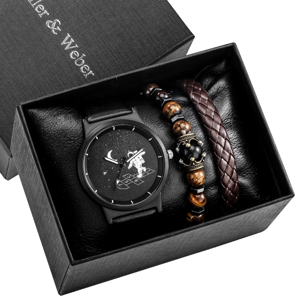 Браслет и наручные часы для мужчин, подарочный набор из черного ква...