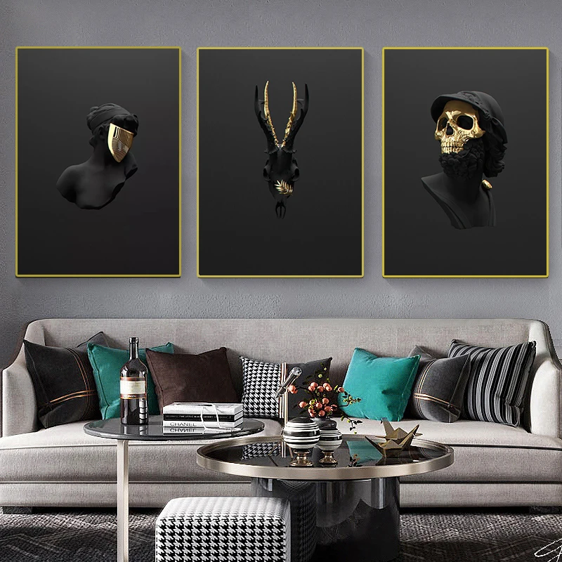 Абстрактная голова черепа быка Металлическая Статуя Картина на холсте Фигурка Скульптура плакат и печать Настенная картина для спальни домашний декор