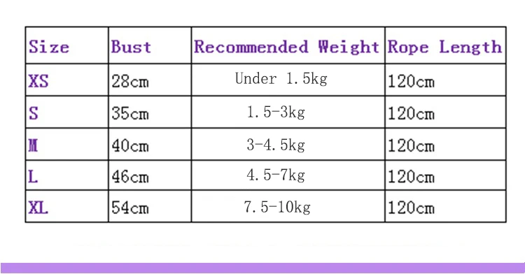 Размер изделия: XS S M L XLXS: обхват груди 28 см, длина веревки 120 см: обхват груди 35 см, длина веревки 120 см мм: обхват груди 42 см, длина веревки 120 см: обхват груди 46 см, длина веревки 120 см XL: обхват груди 55 см, длина веревки 120 см Рекомендуемый вес: