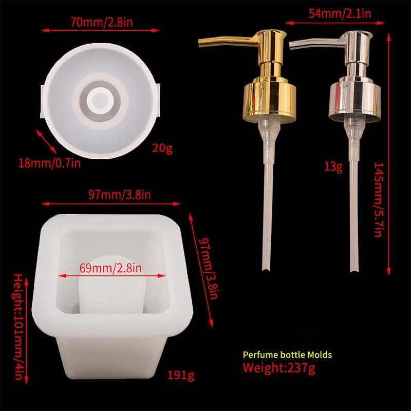 Особенности: Силиконовая форма для бутылок «сделай сам» с насосом, цилиндрическая или квадратная форма для бутылок из смолы, дозаторы для мыла и лосьона для рук для ванной и кухни. Формы для бутылок изготовлены из силиконового материала, обладают хорошей гибкостью и многоразовыми. Насос изготовлен из прочного и антикоррозийного пластика. В комплект входит одна форма для бутылок и 2 насоса или один золотой или серебряный насос. Подтвердите ваш выбор перед размещением заказа. Просто заполните формы из силиконовой смолы эпоксидной смолой, например, добавьте золотую фольгу, сухоцветы или любой элемент, который вы хотите украсить свое ремесло. Удобно демонтировать и чистить, не прилипает. Можно использовать для жидкого мыла, мыла для посуды, лосьона, шампуня, мыла для рук в ванной и кухне.