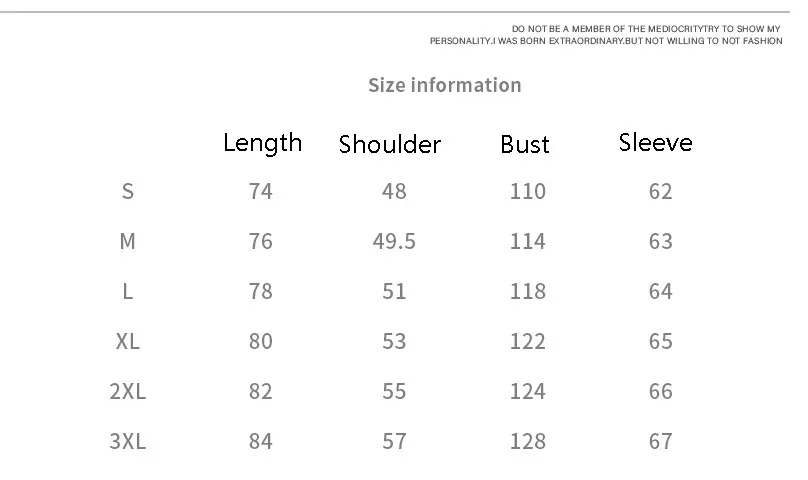 M: Плечо 49; Грудь 110; Длина 73; Рукав 62; L: Плечо 50; Грудь 114; Длина 75; Рукав 63; XL: Плечо 51; Грудь 118; Длина 77; Рукав 64;