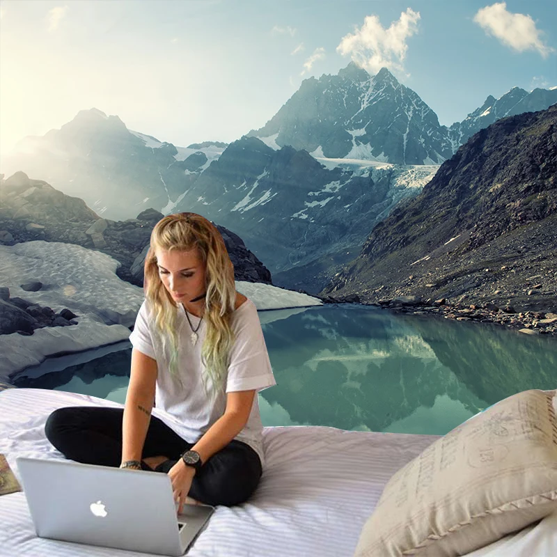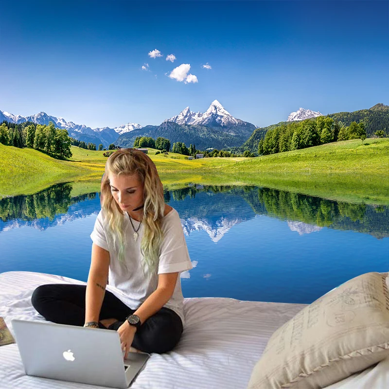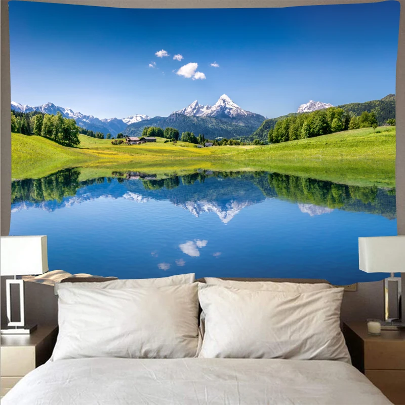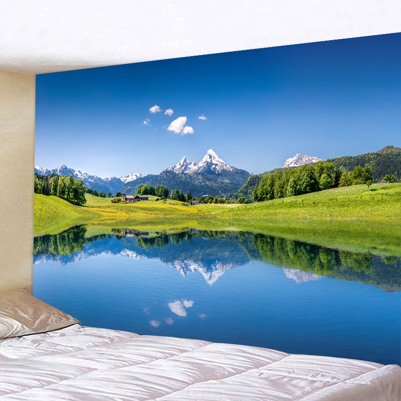 Недорогой гобелен для гор, синего озера, настенный подвесной ландшафт, зеленая трава, Художественная ткань, тонкий потолок, Декор, одеяло, фон