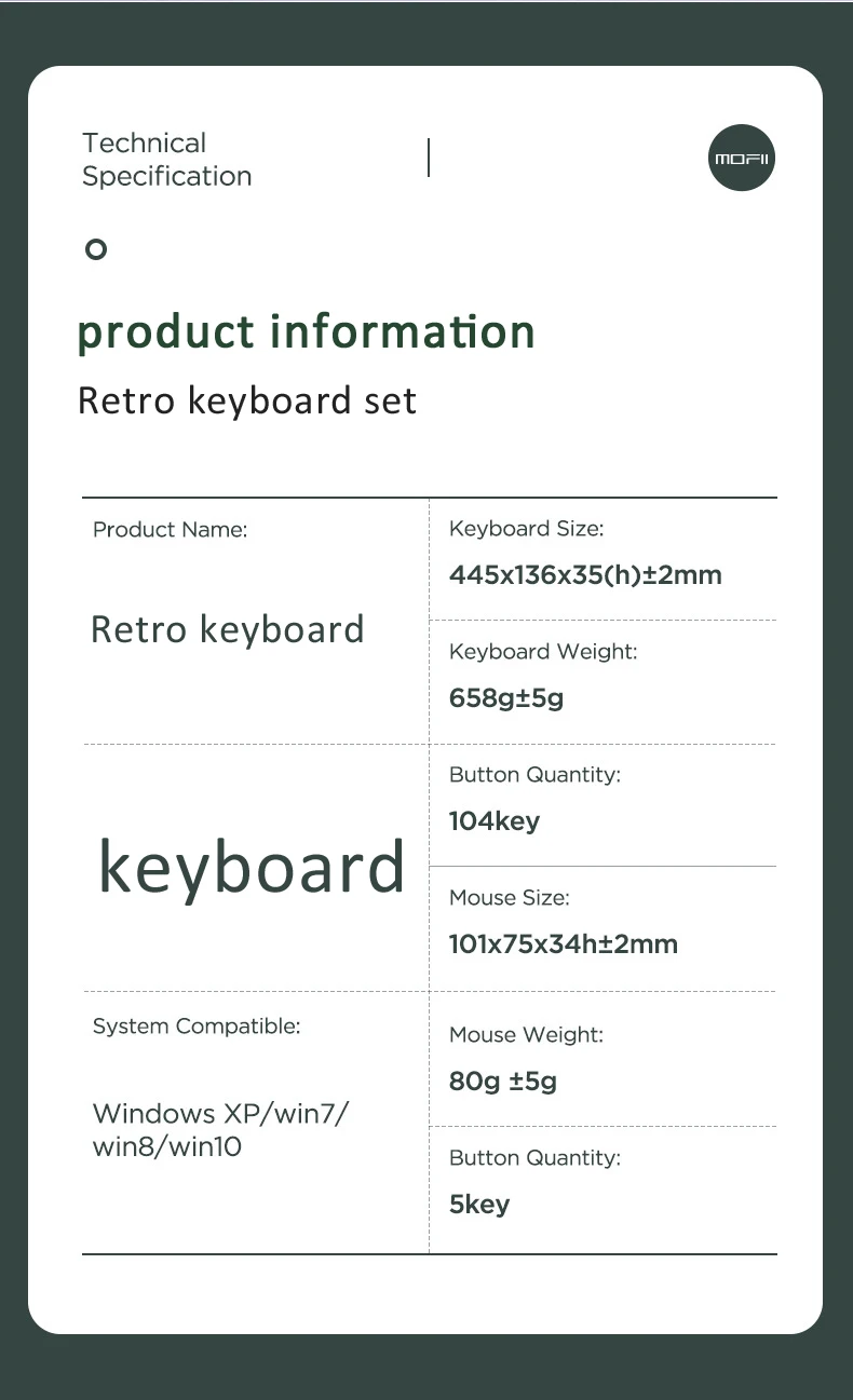 Особенности:Бесшумная и механическая клавиатураБеспроводная клавиатура оснащена механическими клавишами, которые не только подарят вам Прекрасные впечатления от набора текста, но и обеспечивают бесшумное обслуживание, а не Знакомство с другими, идеально подходит для общественных ситуаций.Съемная крышка ключаБлагодаря съемной крышке ключа пользователям удобно чистить пыль со всей беспроводной клавиатуры, особенно в зазоре клавиш.Беспроводной дизайн USBОдин беспроводной USB-приемник 2,4G для сразу подключения клавиатуры и мыши, удобен в установке и эксплуатации.ГуманныйБеспроводную клавиатуру можно поддерживать под углом благодаря складным ножкам, что удобно и удобно в использовании.Ключи 104 штБеспроводная клавиатура спроектирована с 104 смешанными цветными и круглыми клавишами в винтажном стиле, благодаря которым вы сможете приобрести мультимедийные составные клавиши и маленькую цифровую клавиатуру, обеспечивая профессиональное обслуживание.Спецификация:Тип: набор разноцветных клавиатурКоличество: 1 комплектМатериал: пластик + электрический компонентКоличество ключей: 104 шт.Совместимость с системой: для windos xp/ 7/ 8/ 10Размер клавиатуры: 44,5*13,6*3,6 см/17,49*5,34*1,41 дюйма (Д * Ш * В)Размер мыши: 10,1*7,5*3,4 см/3,97*2,95*1,34 дюйма (Д * Ш * В)Ширина USB-приемника: 1,4 см/0,55 дюймаВес: 1200 гПосылка:1 клавиатура1 беспроводная мышь1 * USB-приемник