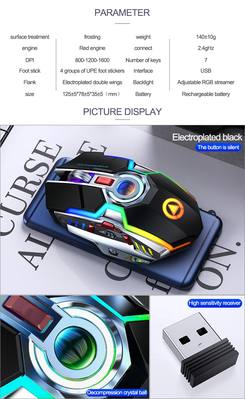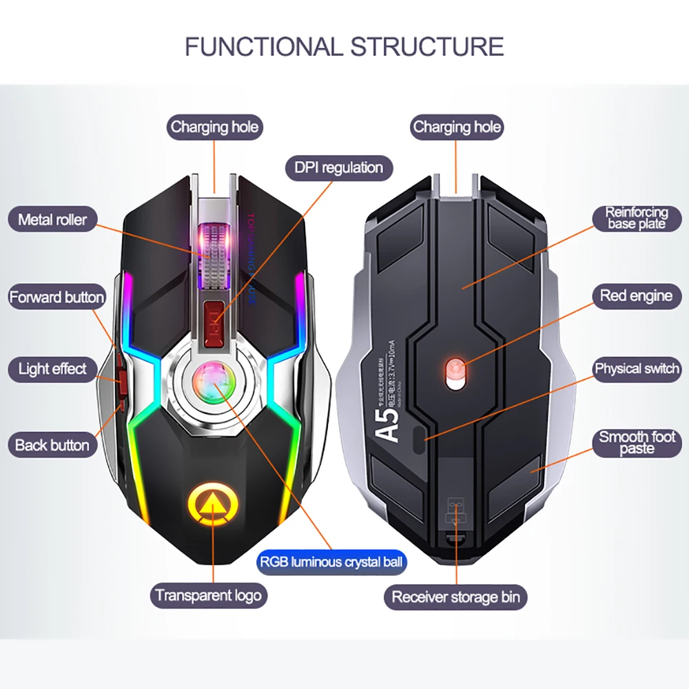 2021 A5 Беспроводная мышь 2,4G перезаряжаемая игровая мышь, RGB-стр...
