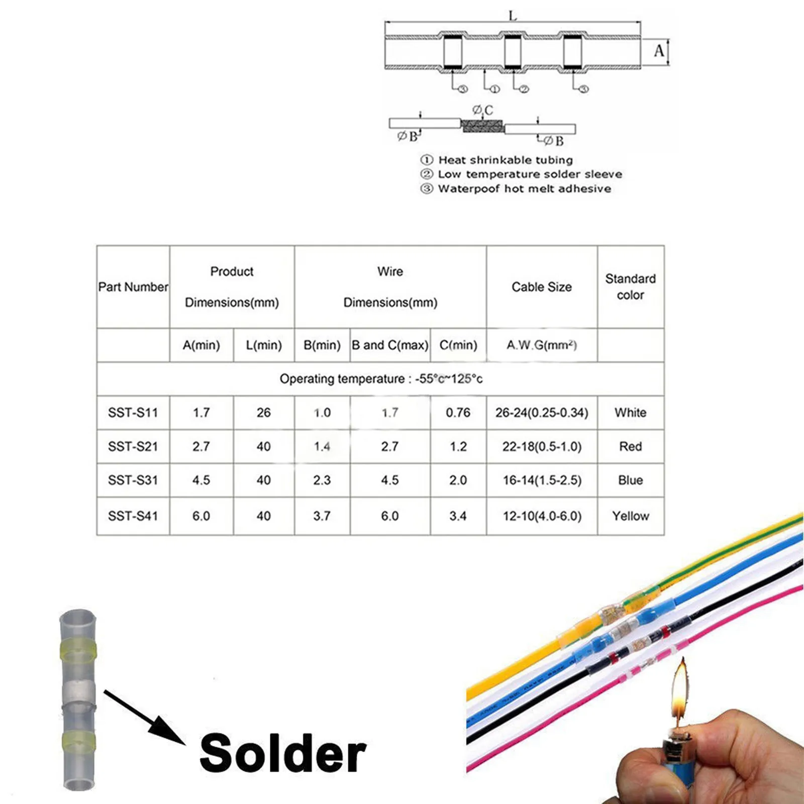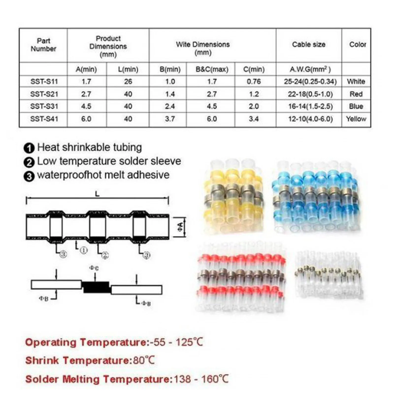 Вы когда-нибудь думал, что может быть так просто подключить сломанный Провода вместе? Вот самое простое и лучшее решение для вас. Эти водонепроницаемые Припой провода разъемы сделаны, чтобы позволить людям подключать провода без каких-либо Технический фон. Водонепроницаемые соединительные провода для припоя Особенности: Легко подключать и припоя провода и уплотнение Двухслойный дизайн; Полиолефиновые трубки + термоплавкий клей Высокая прочность на растяжение обеспечивается термоусадочной трубкой Предотвращает коррозию провода после запечатывания Устойчив к растягиванию и механическим повреждениям Простота в использовании: вставка, подключение и нагрев для уплотнения Прозрачные рукава для легкой вставки проводов Идеально подходит для морских и автомобильных и наружных применений Водонепроницаемые соединительные провода для припоя Характеристики: Материал: Луженая медь Цвета и размеры: Красный разъем: кабель костюма/размер провода 22-16 AWG 0,5-1,5 мм2 Синий разъем: Подходящий кабель/размер провода 16-12 AWG 1,5-2.5mm2 Желтый разъем: кабель костюма/размер провода 12-10 AWG 4.0mm2 Белый разъем: кабель костюма/размер провода 26-24 AWG 0,25-0,34 мм2 Что вы получаете: 250pc Припоя провода разъемы