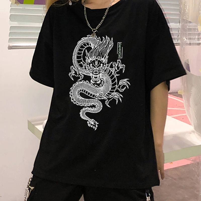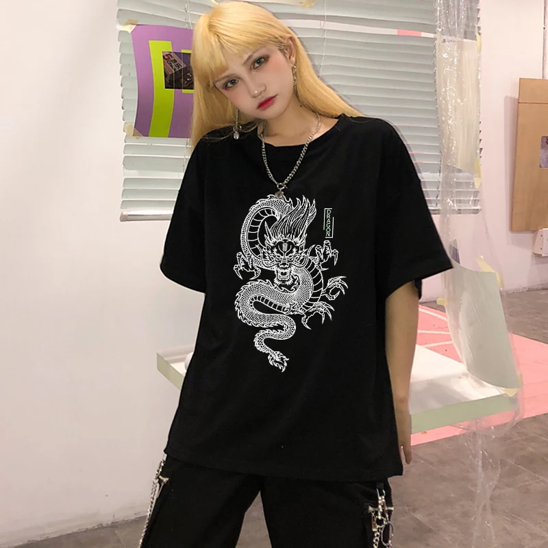 Женская футболка с принтом дракона, винтажная свободная футболка большого размера в стиле панк, в стиле ольччан, Харадзюку, лето