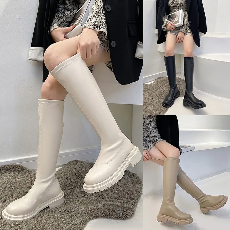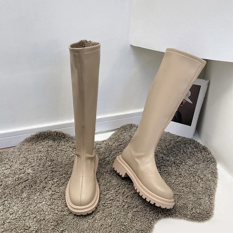 Модные женские сапоги, зимняя обувь, осенние сапоги до бедра, женские сапоги до середины икры для девочек, кожаные сапоги на платформе, женские высокие