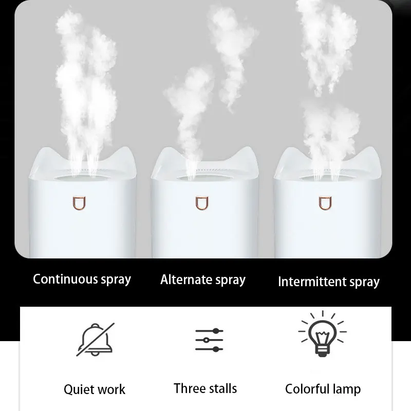 Характеристики:Область применения:<20 ㎡ РабочаяНапряжение: DC5VРабочий ток: 1000 мАУслуги мощность: 3,5-4WЕмкость воды: 3000 млВремя работы: 8-16 часовКоличество распыления: 45-60 мл/чМатериал: ABS + PP + ElectricРазмер изделия: 251*150,8*150.* ммИсточник питания: USB кабель (без аккумулятора, не заряжается) Цвет: белый, розовый Особенности:Ультразвуковой увлажнитель воздуха с двумя насадками и распылителем, с лампой для окружающей среды, милый котенок, в сочетании с цветной лампой для окружающей среды: милый котенок, очаровательный дизайн для домашних животных, идеально подходит для украшения вашего домашнего пространства. Портативный для дома, йоги, офиса, спа, спальни, детской комнаты и т. д. Супер тихий: диффузор использует ультразвуковую технологию и работает тихо. Это не будет разрушительным во время сна. 3000 мл большой емкости. Пополнение красоты, автомобиль, дом, офис, многоразовое использование. Действия и посылка:1. Короткое нажатие Включите режим распыления.2. Короткое нажатие снова включите прерывистый режим распыления 3. Короткое нажатие в третий раз выключить spra4. Длинный нажимной переключатель, включающий светодиодный светильник, по умолчанию меняющий цвет светильник 5. Длинный нажимной выключатель снова крепится на светильник.6. Длинный пресс-переключатель еще раз выключает светильник Упаковка входит в комплект1x увлажнитель1х упаковочная коробка1x usb кабель