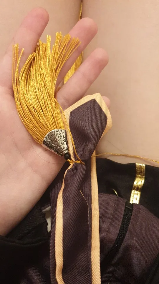 Парик очень мягкий и длинный, шляпа немного маленькая и куртка идеального размера. Единственное, что плохо, это то, что 2 маленьких узора отшелушиваются, как наклейка, и что цветы на лентах легко спадали, а струна отвалилась, поэтому мне пришлось его связать. Их легко пришивать, но это немного разочаровывает, что они легко ломаются. Но в любом случае Косплей действительно хороший