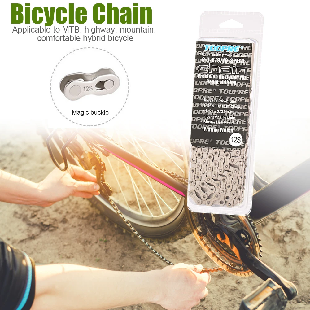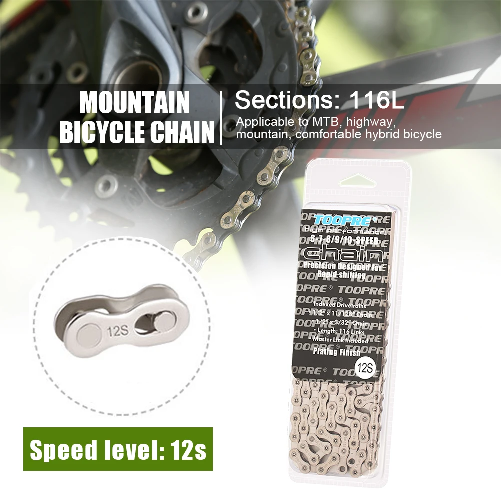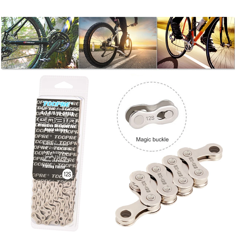 Цепь TOOPRE для дорожного велосипеда, 116L 12 В, Волшебная пуговица, горная цепь с оригинальной коробкой, цепи из углеродистой стали для горного велосипеда, 12 Скоростей