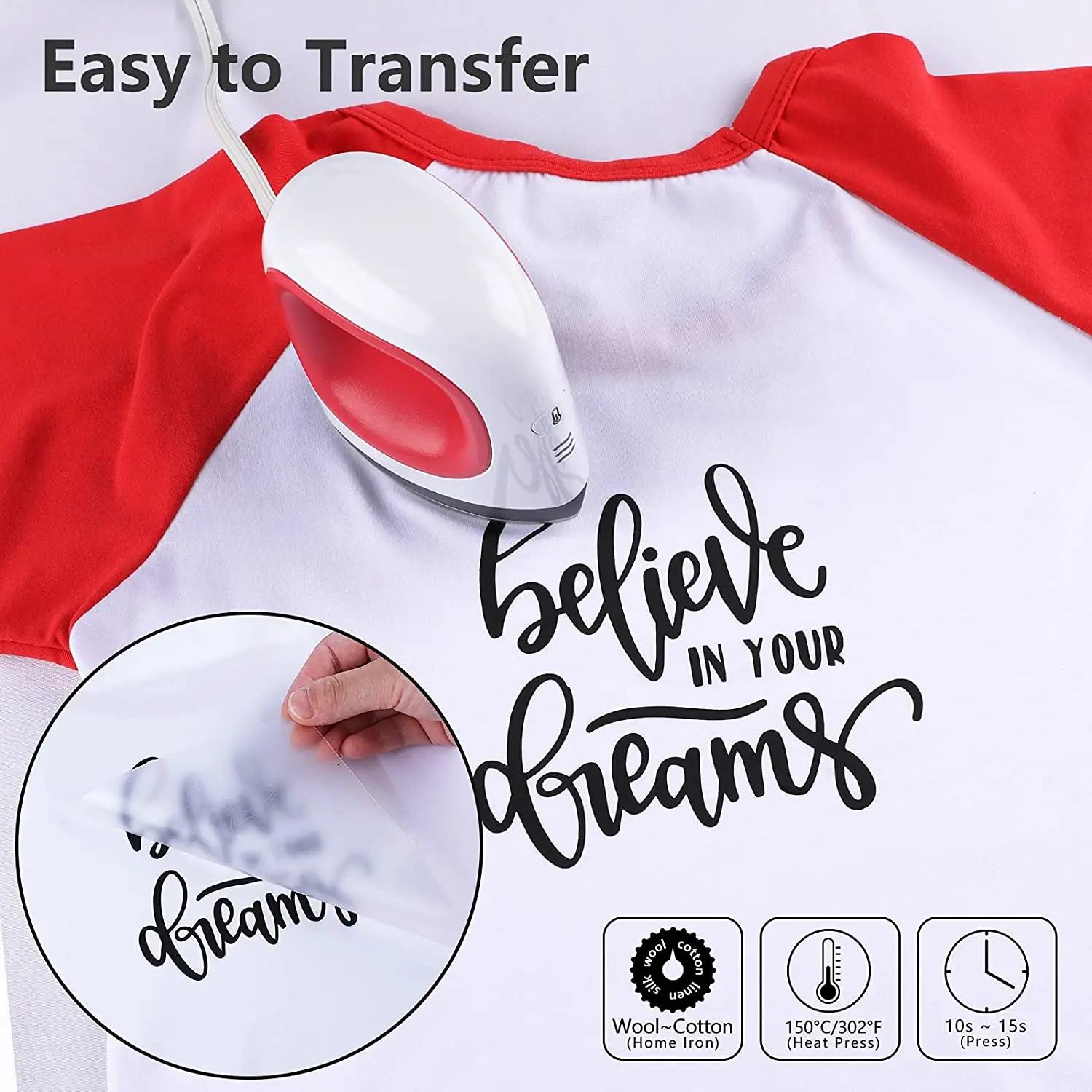 Материал, который поставляется на прозрачном несущем листе с отличной стабильностью размеров и очень хорошими характеристиками резки. Легко наносится лучше всего для Cricut Silhouette Cameo и всех других штампованных режущих машин, подходящих для утюга на передающих машинах, термопресс-машина даже для домашнего утюга.