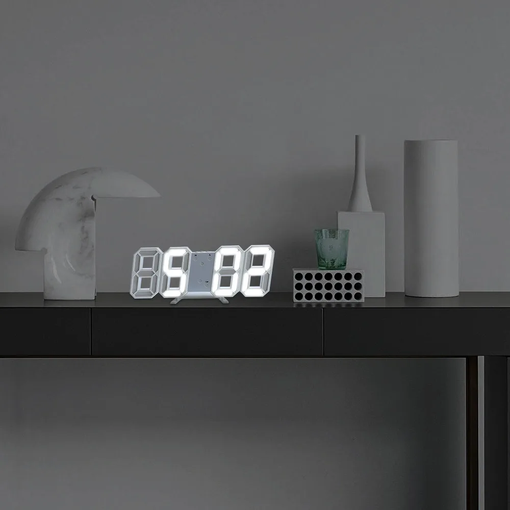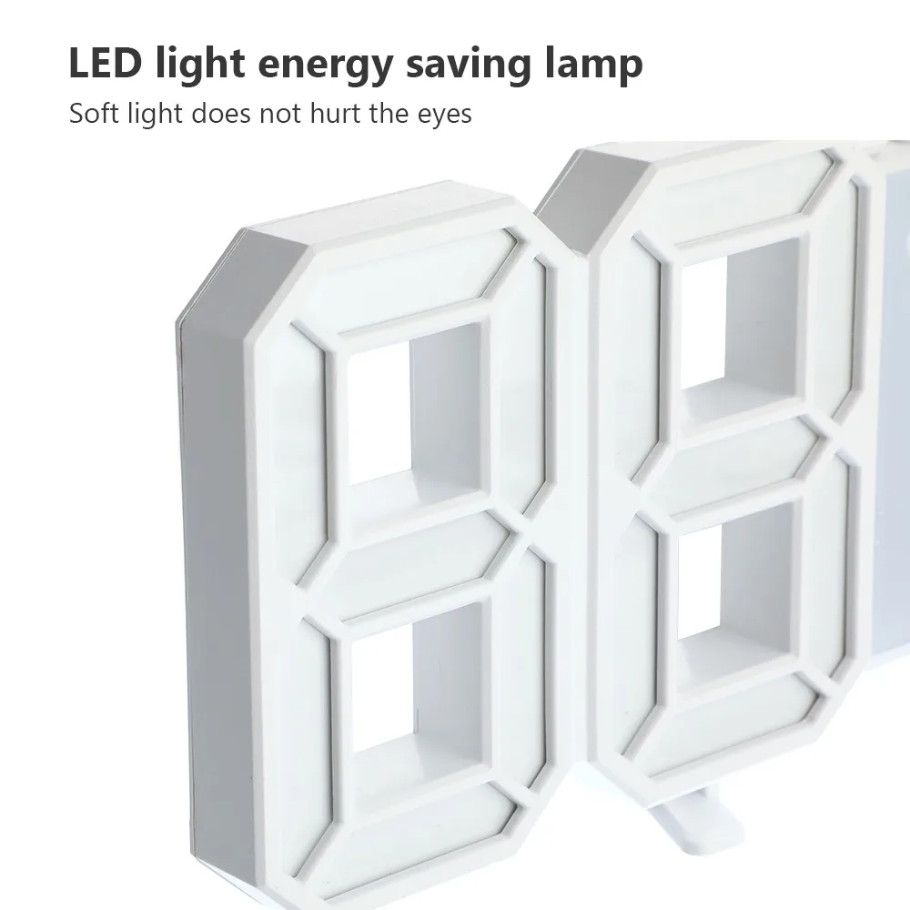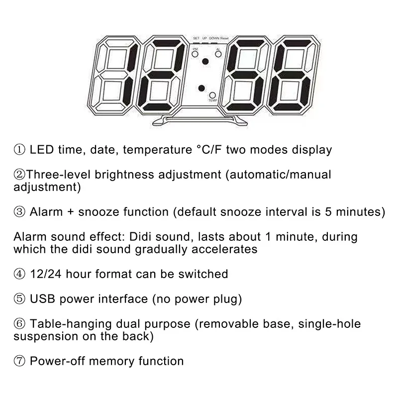 Особенности:Большой номер дисплея: позволяет четко проверять время с помощью 3D типа, даже если это далеко от вас.3 уровня регулируемой яркости: яркий-средний-тусклый, 3 варианта отвечают всем вашим потребностям днем и ночью. Вы можете вручную настроить яркость или установить его в автоматический режим. И он будет регулировать яркость в соответствии с окружающей средой, защищая ваши глаза. 12 или 24 часа дисплей доступен на выбор. Также функция памяти сохранит настройки.Функция повтора: по умолчанию время повтора составляет 5 минут, вы можете установить время повтора от 5-60 мин в соответствии с вашими требованиями.Лучшее украшение: мода и большой 3D цифровой является лучшим украшением на вашей полке.Можно положить на стол, повесить на стену как Висячие часы.