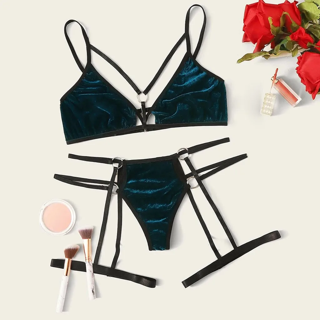 Бархатное чувственное нижнее белье, Женский однотонный комплект с бюстгальтером, Комплект эротического нижнего белья, Женский комплект из 2 предметов, сексуальное женское нижнее белье, пояс с подвязками
