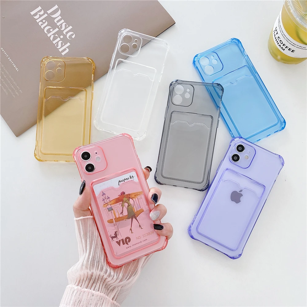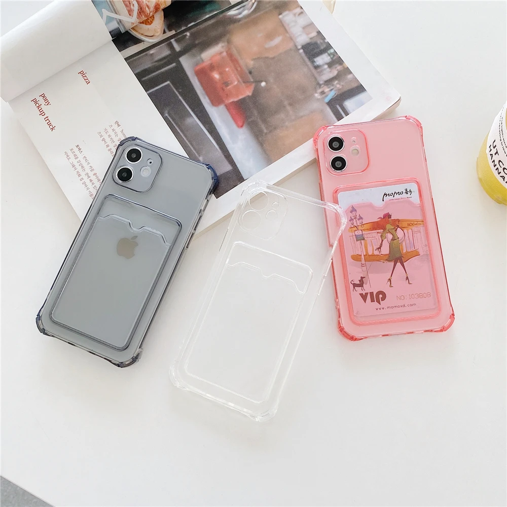 Мягкий Силиконовый противоударный чехол-бампер для iPhone 13, 11 Pro, 12 Mini, X, XR, XS Max, 7, 8 Plus, SE2, прозрачный, с держателем для карт