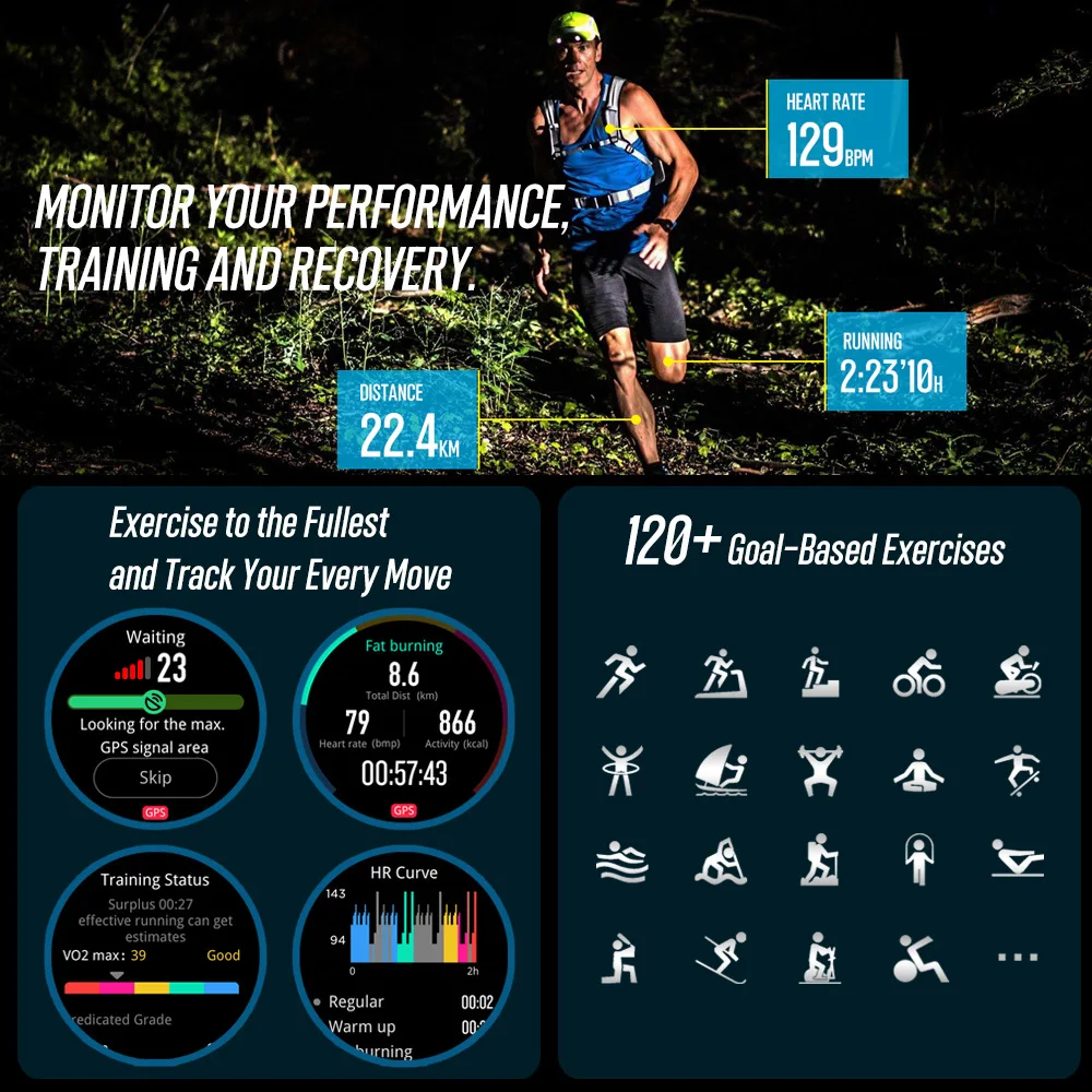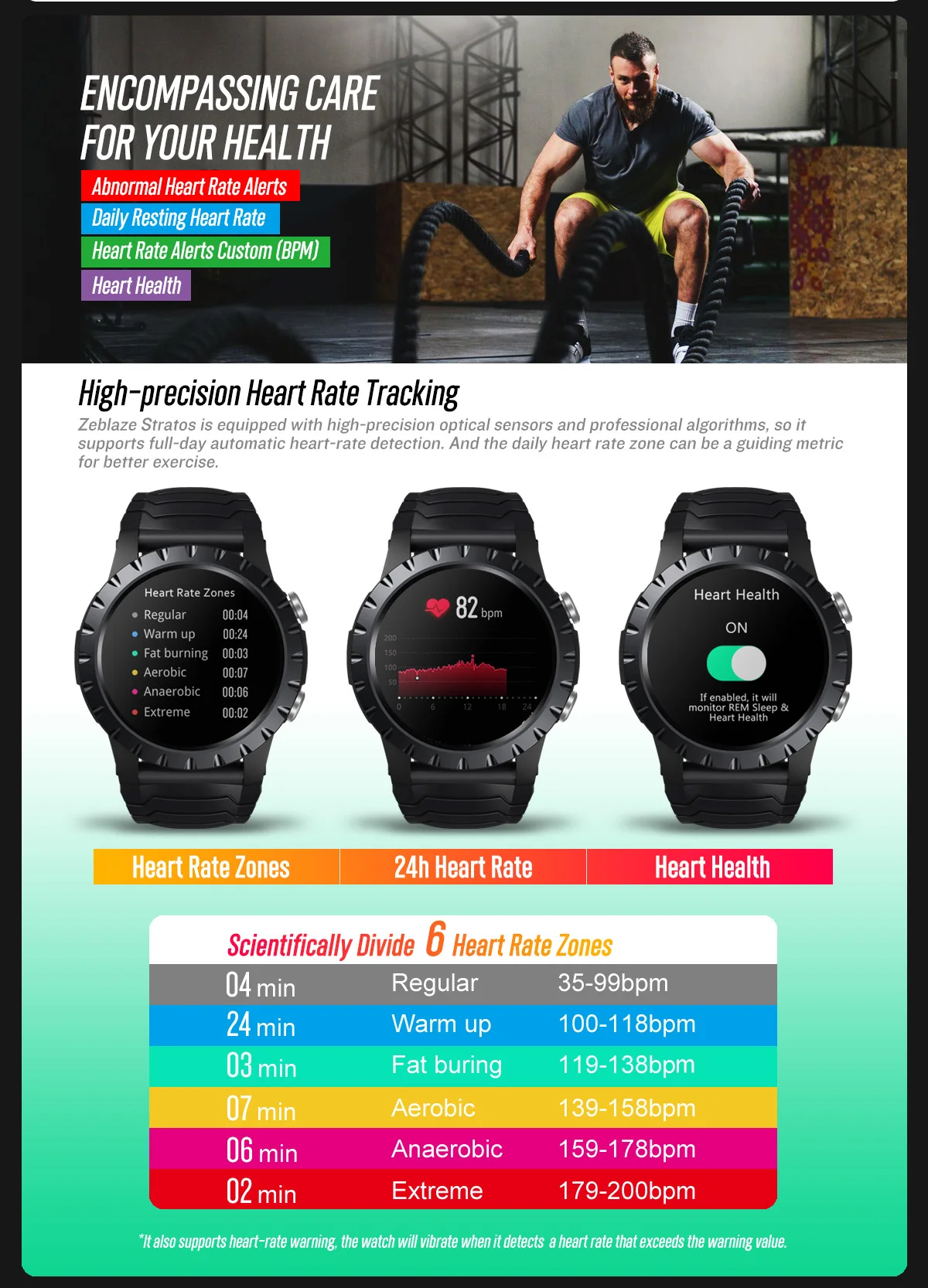 Zeblaze Stratos поставляется со встроенным GPS, компасом и альтиметром в режиме обучения, а также пульсом на запястье, GPS, тестами производительности и отслеживанием восстановления. Он предлагает вам руководство и данные, чтобы помочь вам получить более сильные и основные функции умных часов, чтобы вы были подключены. Чехол изготовлен из армированного углеродным волокном полимера, поэтому он достаточно прочный и долговечный, чтобы выдерживать любые внешние условия окружающей среды. С Stratos, если вы тренируетесь на улице в течение 3 часов каждый день, он может обеспечить вам 25 дней выносливости в режиме смарт-часов. Stratos для вас, где бы и что бы вы ни делали.