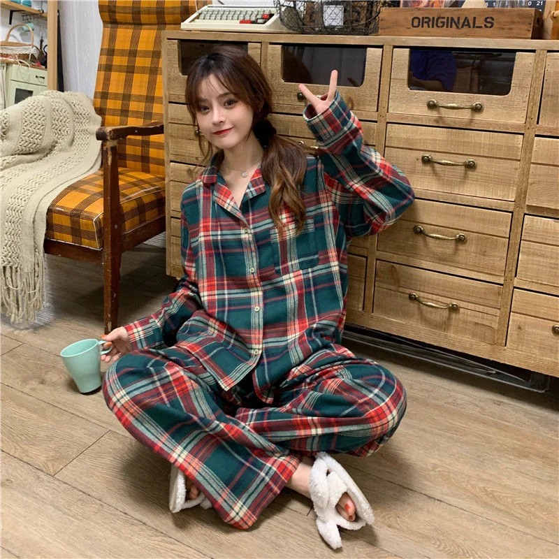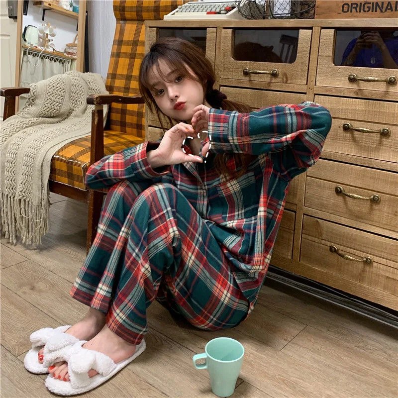 Женский пижамный комплект в Японскую клетку, пижама с отложным воротником и длинным рукавом, мягкая женская одежда для сна, осенняя Домашняя одежда, домашние услуги