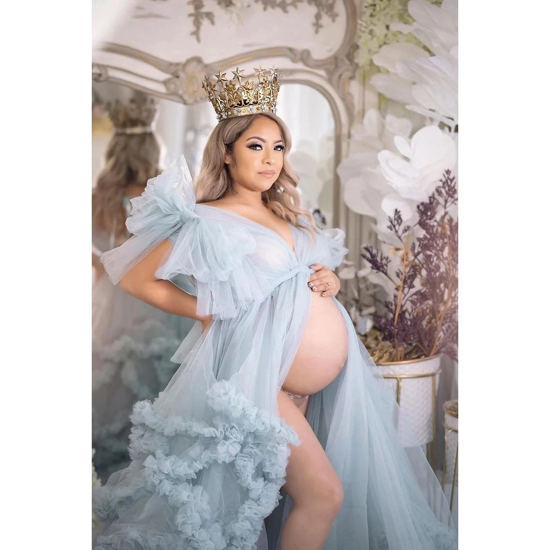 Пыльный синий тюль для беременных женщин для фотосъемки халаты с оборками пышный тюль для беременных женщин платье для будущей мамы на заказ