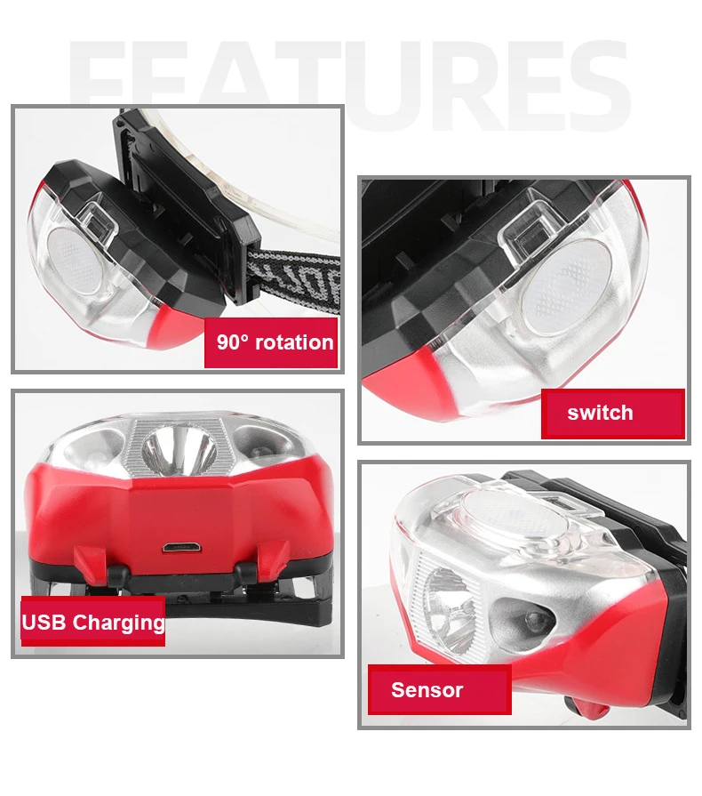 Светодиодный мини-фонарь с датчиком, портативный Головной фонарь с аккумулятором и кабелем, зарядка через USB, для рыбалки, ночного бега