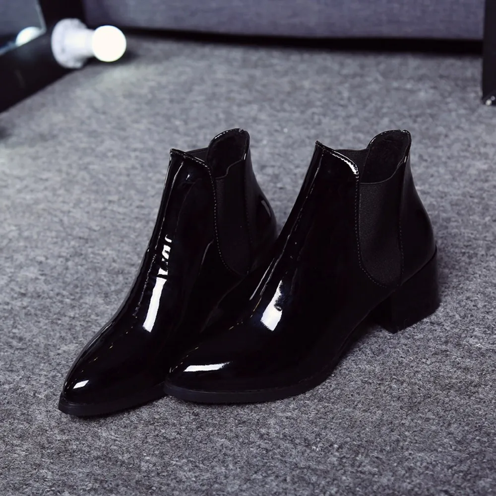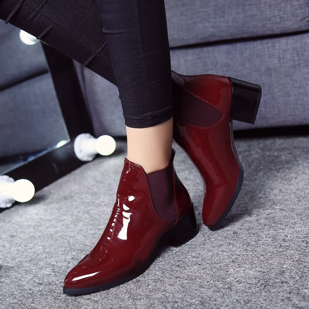 Новое поступление 2020, модная обувь, женские ботинки, эластичные ботильоны из лакированной кожи, ботинки с острым носком на низком каблуке, женская сексуальная обувь