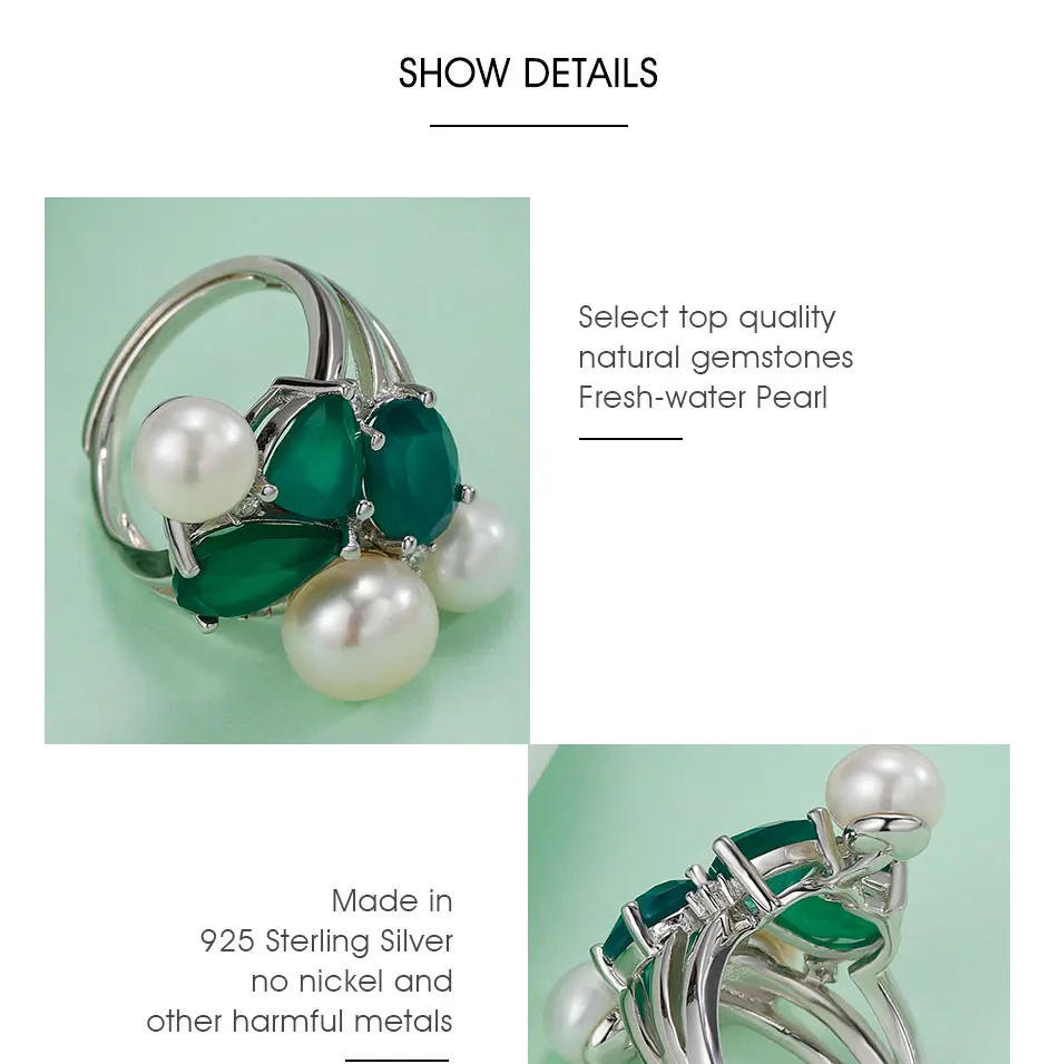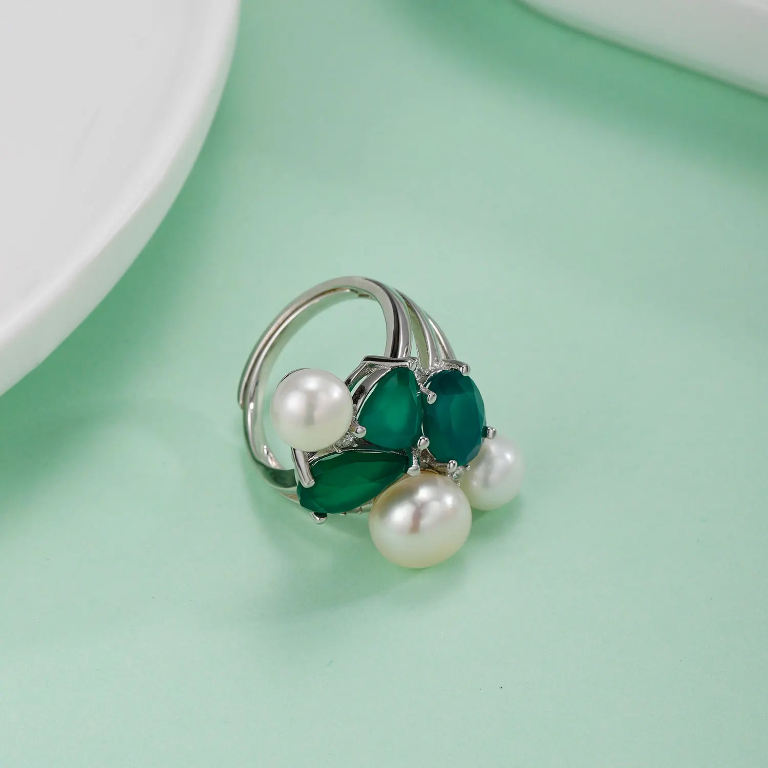 Женское кольцо с натуральным зелёным агатом и пресноводным жемчугом