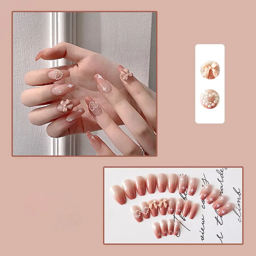 Накладные ногти, французский гроб, жемчужный бант, искусственные ногти балерины, полное покрытие ногтей, накладные ногти с клеем, 24 шт.
