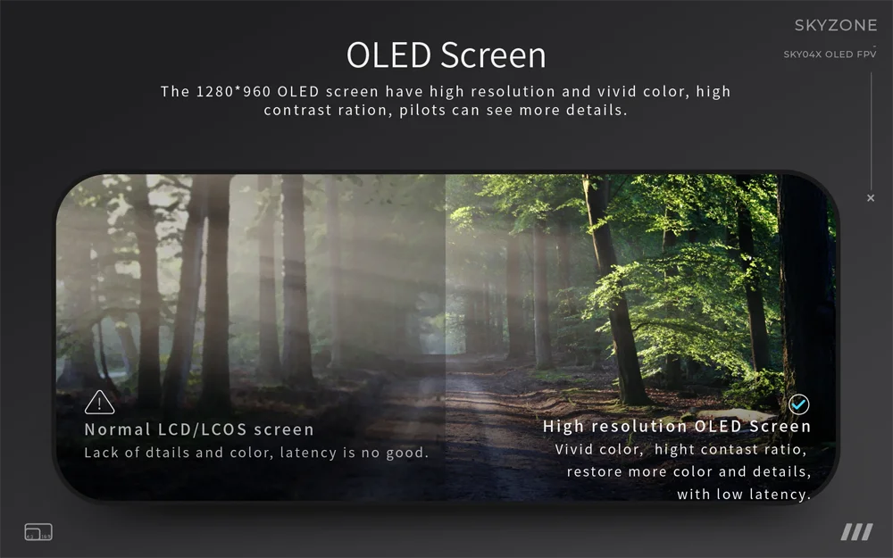 SKY04X-это первые очки skyzone с регулировкой фокуса, экран с высоким разрешением 1280*960 имеет яркие цвета и высокую контрастность, пилот может увидеть больше деталей в гонках.
