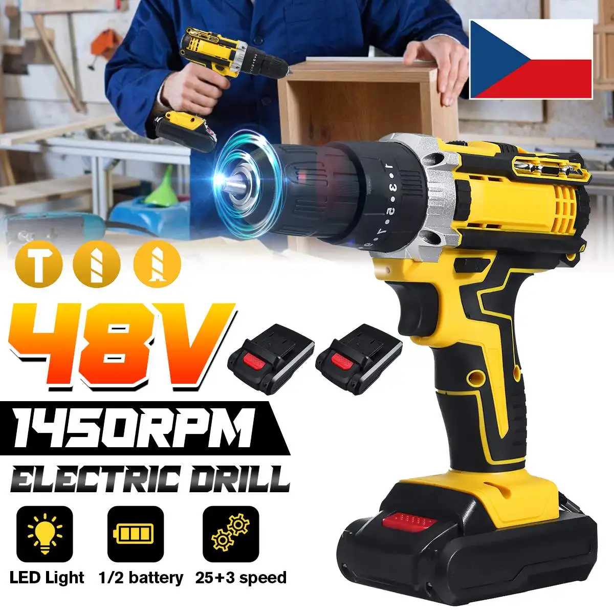 Спецификация:Название: электродрельНапряжение аккумулятора: 48 ВМаксимальный крутящий момент: 25-28 нмСкорость холостого хода: 0-450 об/мин, 0-1450 об/минВход: 110-240 В, 50-60 ГцВыход: 1,3 АВилка: вилка СШАПосылка1 электродрель1 х адаптер питания1 или 2 батареи (опционально)