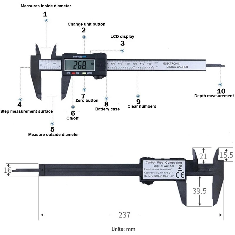 Разрешение: 0,1 мм/0,01 дюймовТочность: 0,2 ммРазмер: 245x80x12 ммМощность: 1,5 V аккумулятор для телефонаLR44(Не входит в комплект)Вес: около 55 г