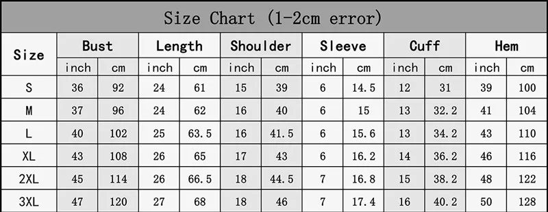 1. Измерьте фактическую длину рубашки, бюст, плечо и рукав, сравните с нашей таблицей размеров.2, это Азиатский Размер, и это только для справки, может иметь 1-3 см различия из-за ручного измерения.3. Внимание: из-за разницы между различными мониторами изображение может не отражать фактический цвет изделия.