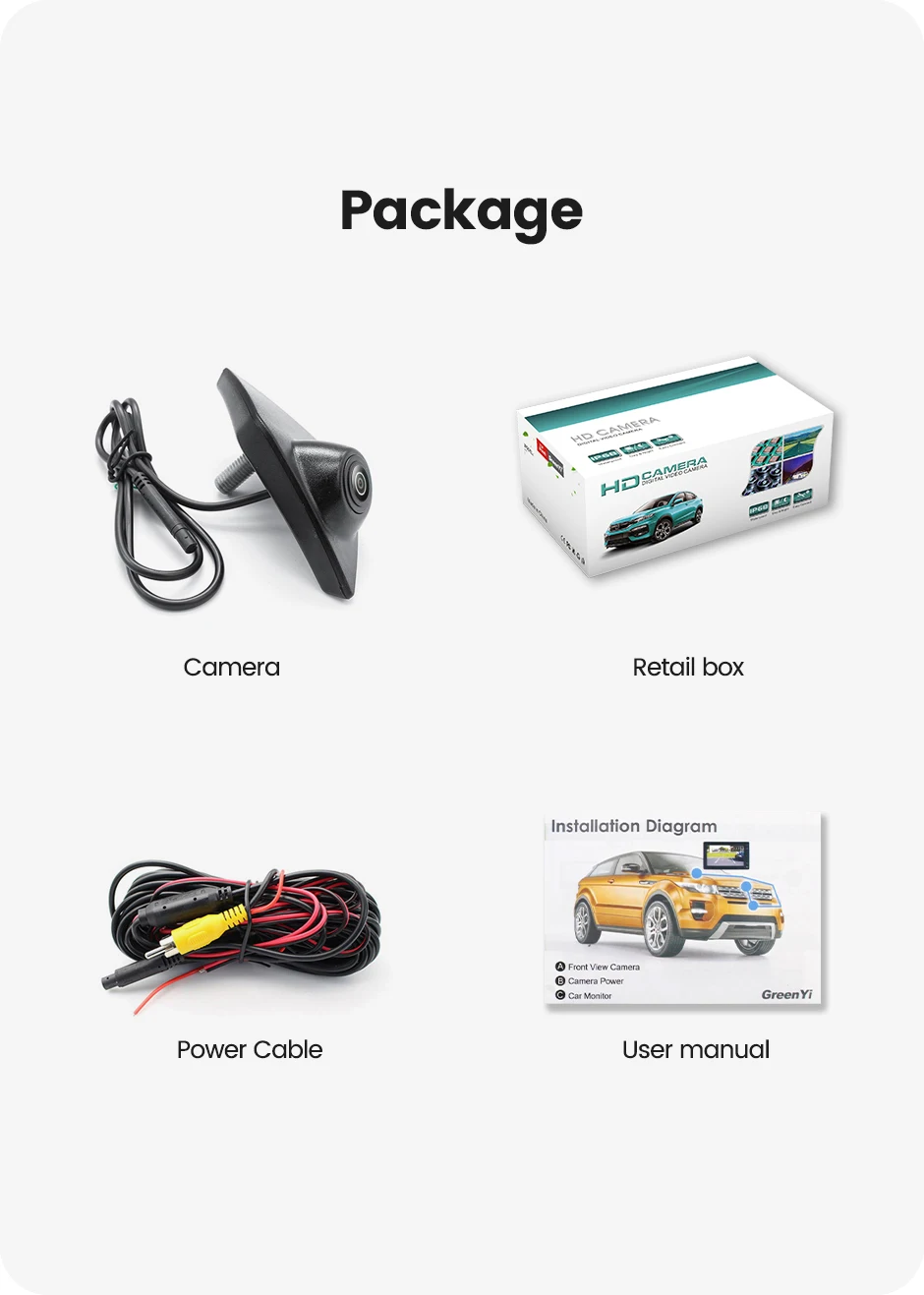 1. Камера Переднего Вида2. Розничная коробка3. Кабель питания4. Руководство пользователя