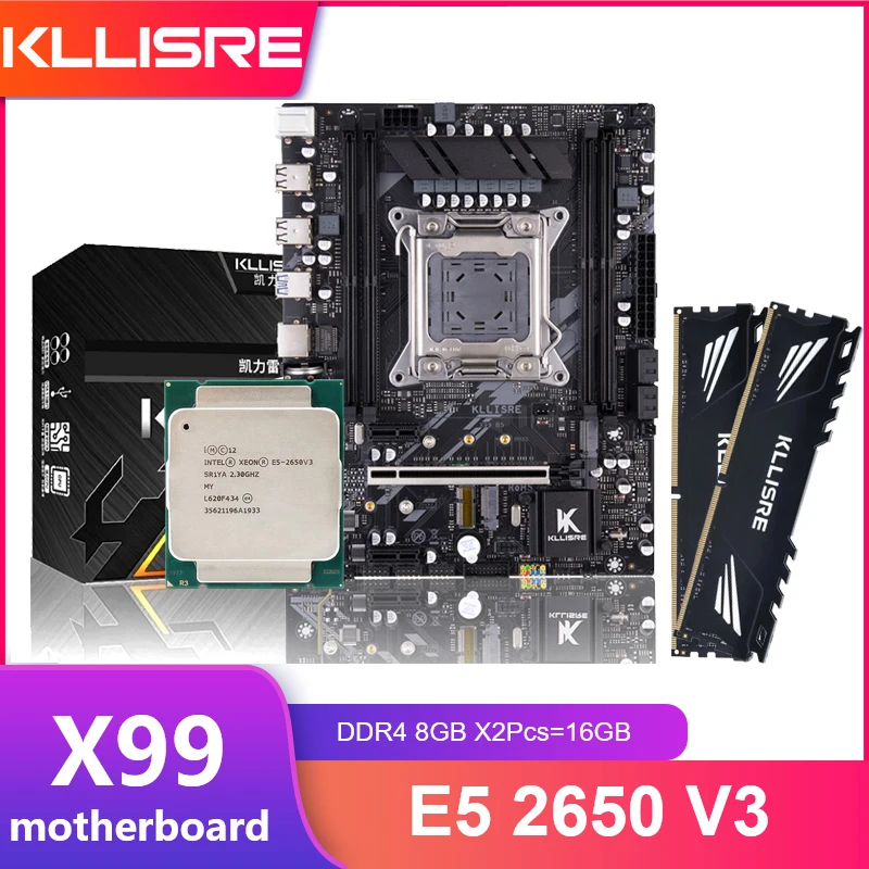 Комплект из материнской платы Kllisre X99, процессор Xeon E5 2650 V3 LGA 2011-3 2 шт. X 8 ГБ = 16 Гб 2666 МГц, Память DDR4
