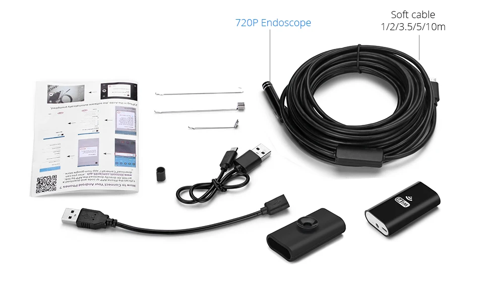 1 × 720P wifi эндоскоп камера1 × набор аксессуаров-крючок, боковое зеркало, магнит1 ×Charging кабель1 ×Transmitter1 ×User руководство
