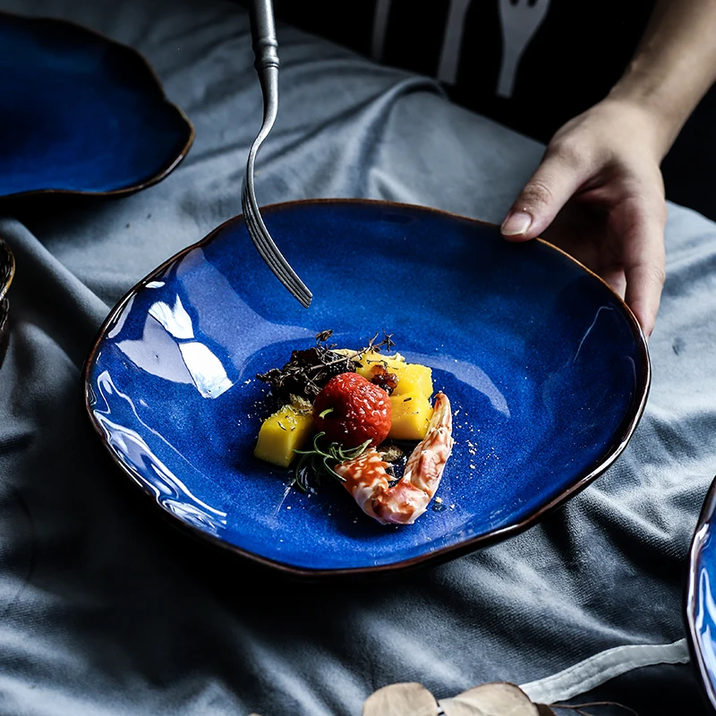 Керамическая блюдо неправильной формы JAGENCN в скандинавском стиле, блюдо для салата, столовые приборы с синей глазурью, блюдо для еды, глубокая тарелка, Бытовая Посуда