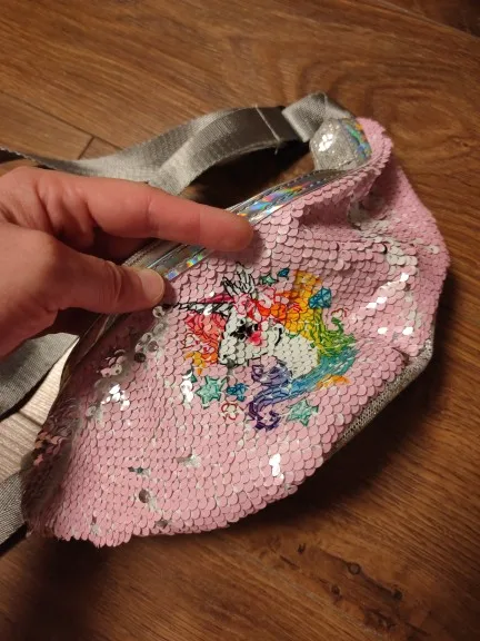 Рисунок единорога и блестки: изысканный рисунок единорога, обратимое украшение из блесток, сделает вашу сумку центром внимания.