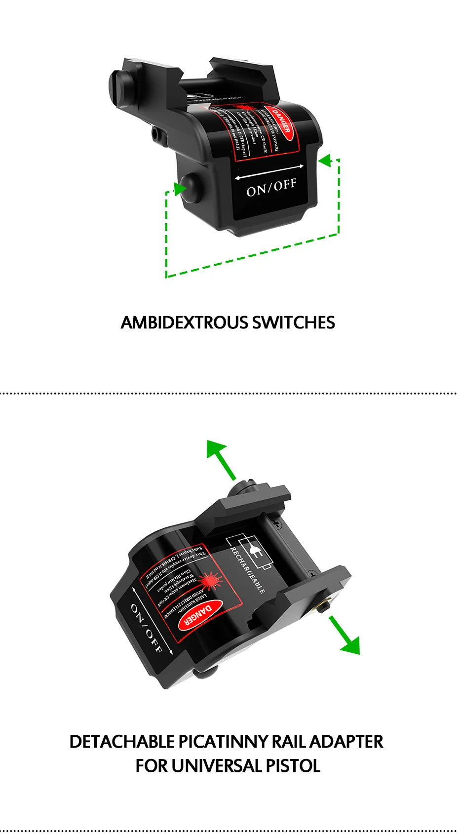 Подходит для всех пистолетов с Пикатинни. Ударопрочный и низкий уровень работы. Лазер может быть отрегулирован (L/R, U/D)