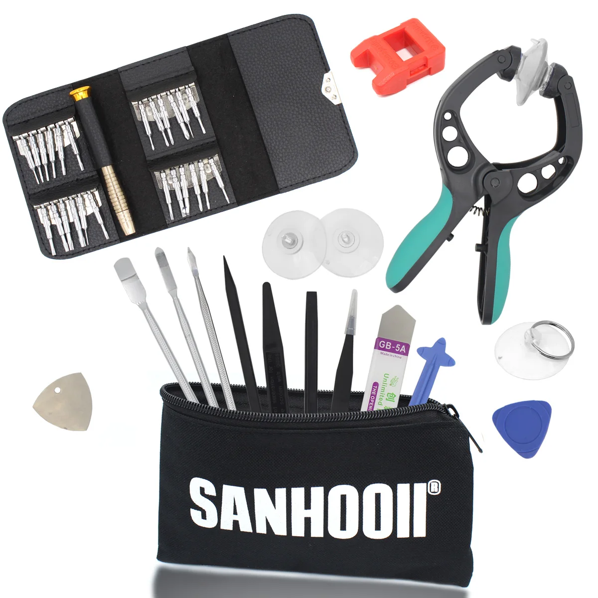 【Отвертка】Высокоточные биты для отвертки - 24 шт., изготовленные из высококачественной (хромованадиевой) стали. Твердость стали может достигать HRC 52-60. 【Плоскогубцы с присосками】Специально разработанные для iPhones. Идеально подходят для ремонта мобильных телефонов, ноутбуков, персональных цифровых помощников, ПК и других устройств. 【Инструмент для вскрытия】Оснащен умным кончиком и противоскользящей ручкой. 【Устройство для захвата винтов】Если отвертки потеряют свои магнитные свойства, их можно повторно намагнитить. 【Сумка для инструментов SANHOOII】Изготовлена из прочной рубашечной ткани и удобна для переноски.