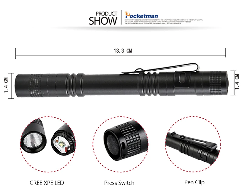 Особенности:1. Портативный мини-размер, форма, как ручка, только в том случае, 13,3 см длина.2. Способен надежно стоять на плоской поверхности, чтобы служить свечей.3. Просто 1 переключатель режима освещения дизайн.4. Максимальная выходная яркость может достигать 500 люмен.5. Поставляется с зажимом, подходящим для переноски.6. Противоскользящая, износостойкая и обычная водонепроницаемая конструкция.Характеристики: