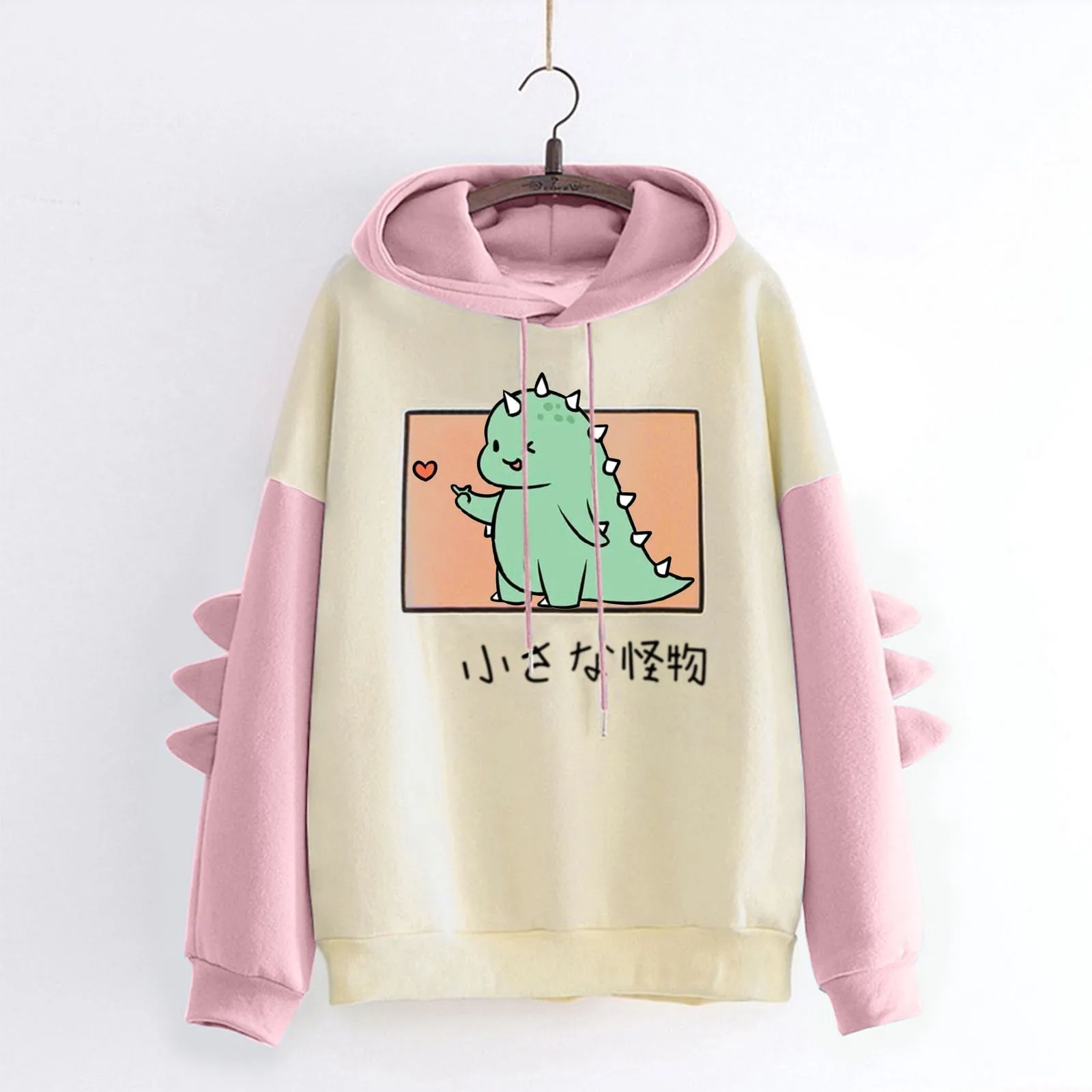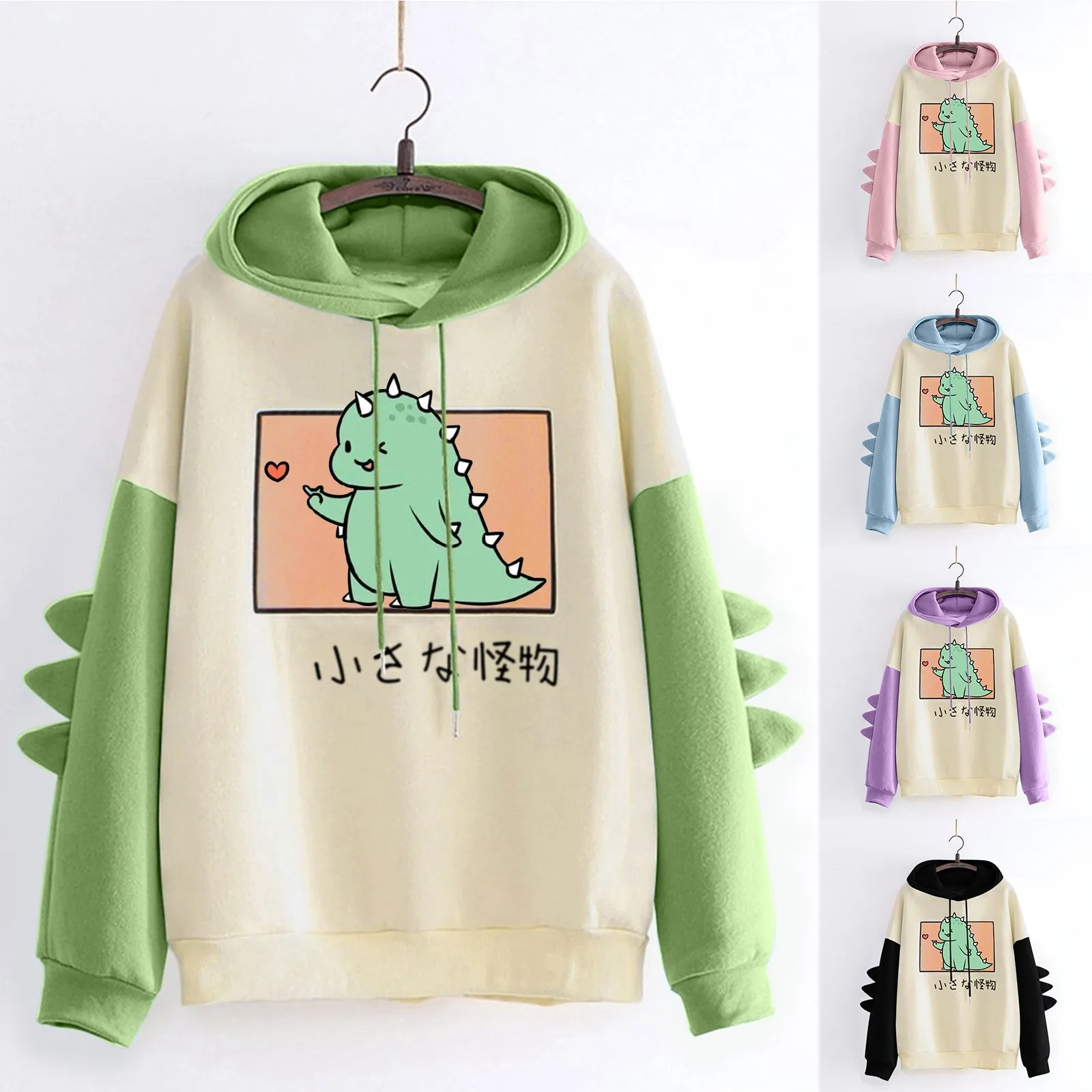 Толстовка женская с капюшоном и принтом динозавра, Модный повседневный утепленный свитшот с принтом в Корейском стиле, худи с динозавром, осень